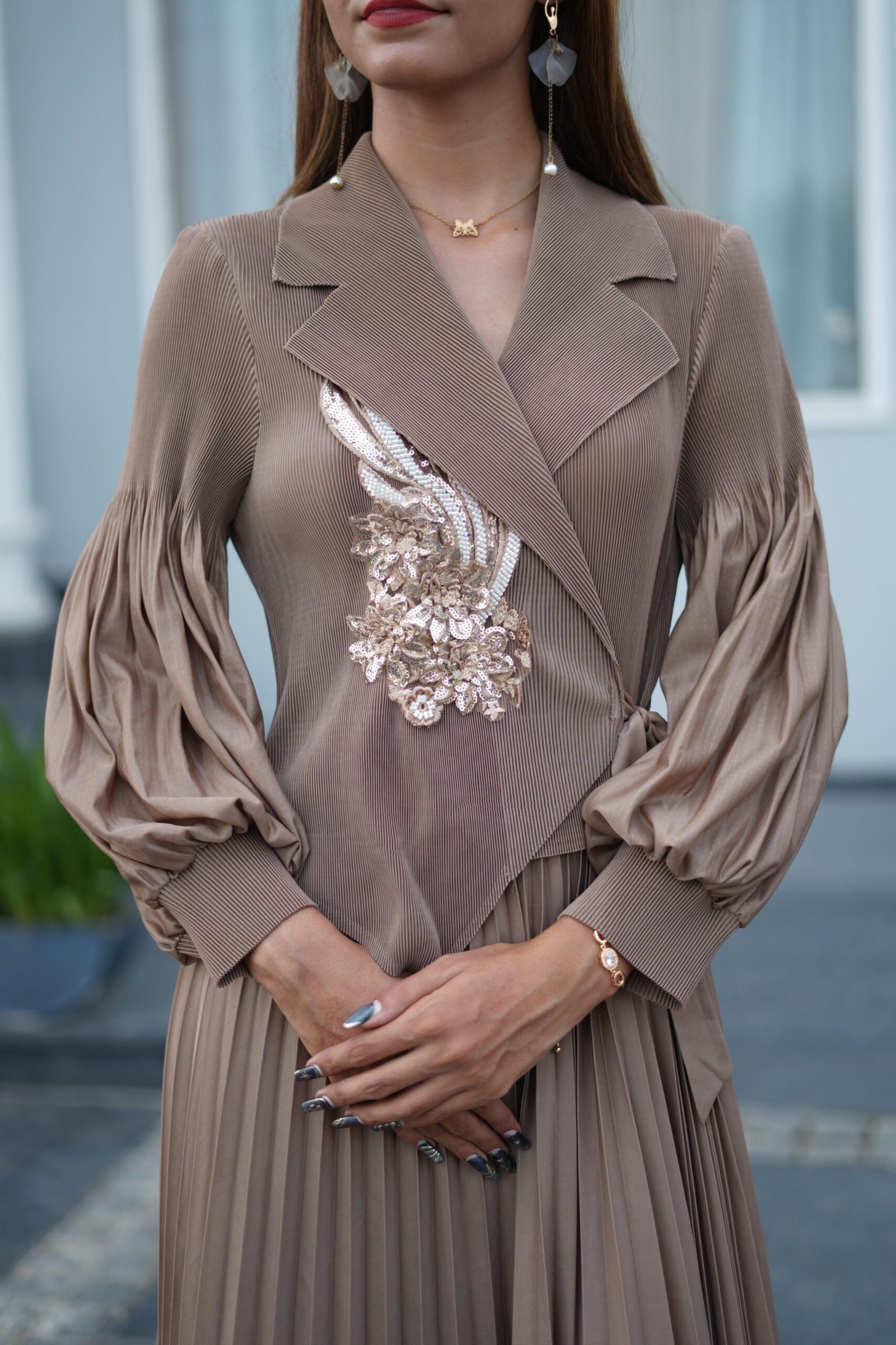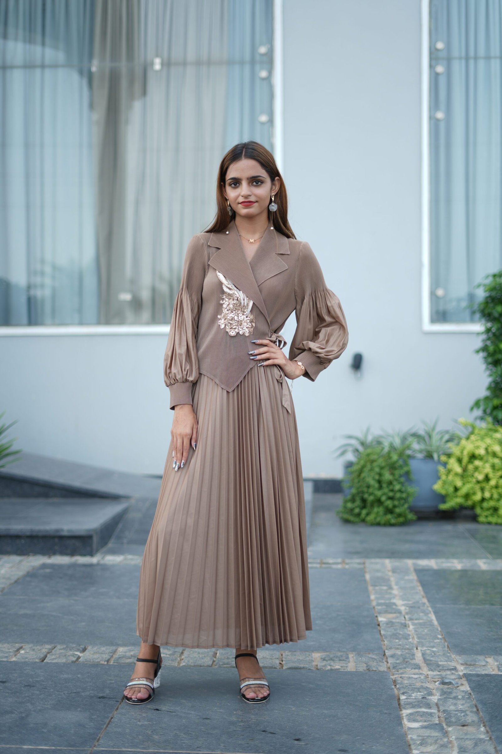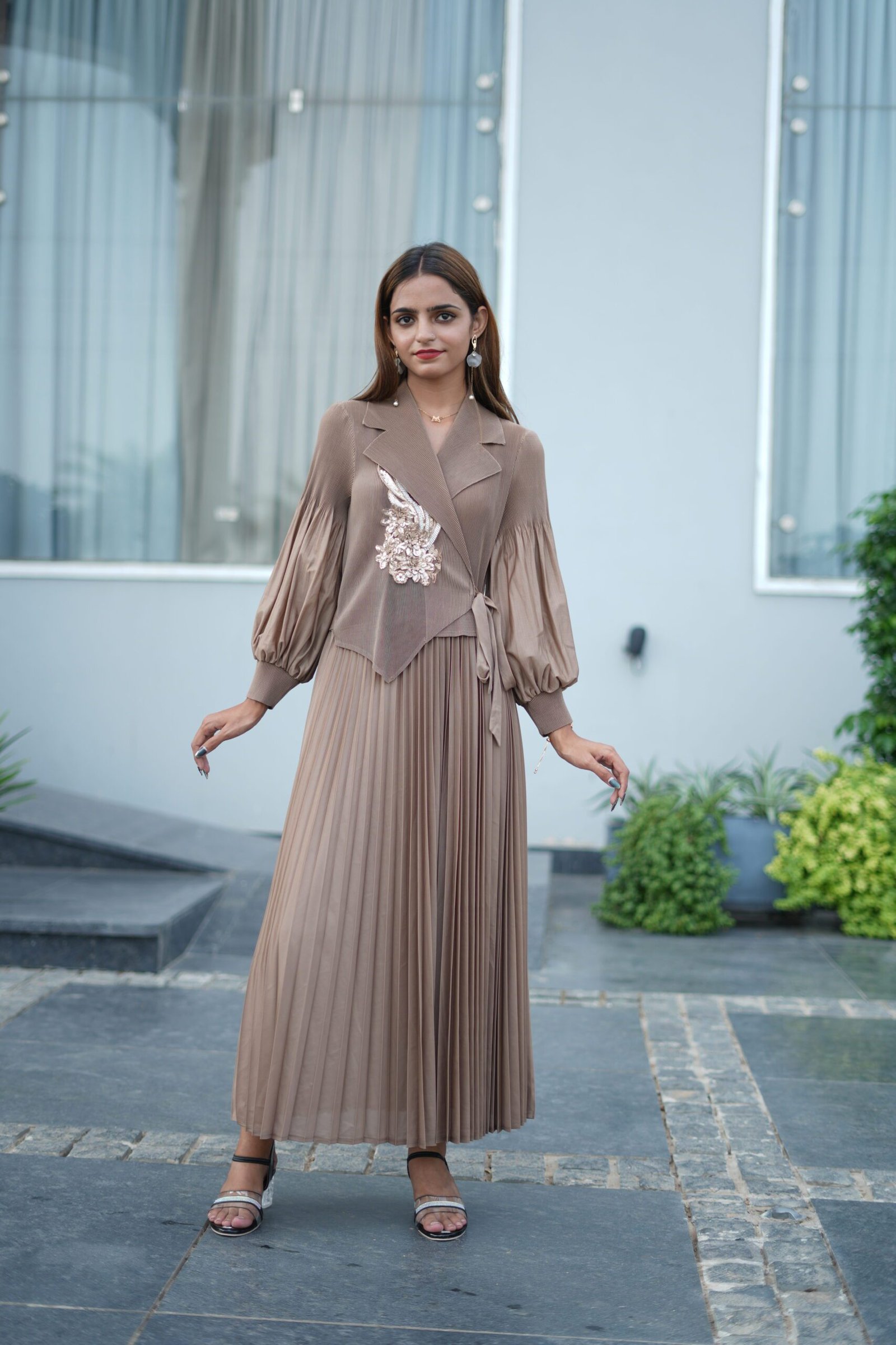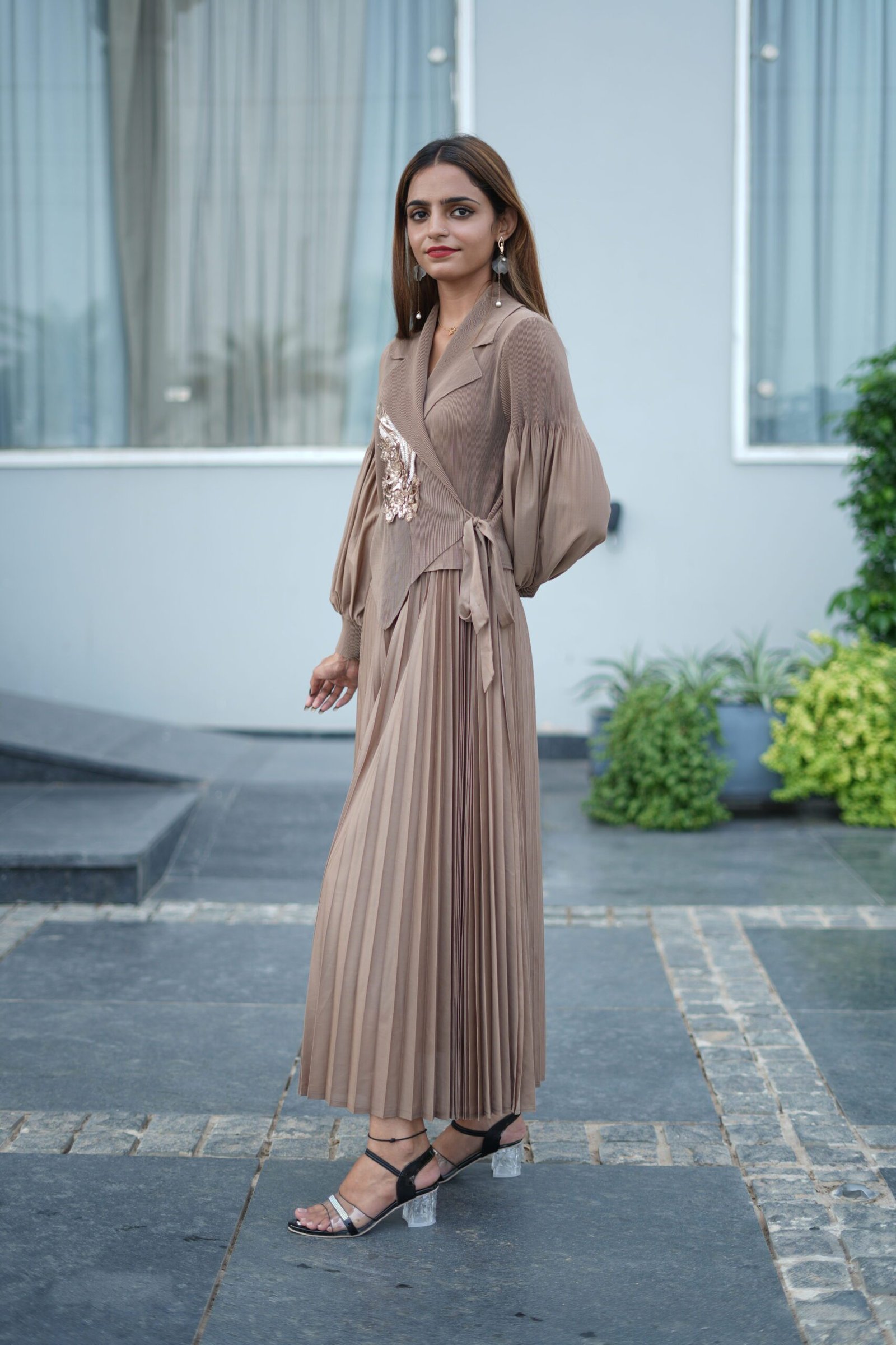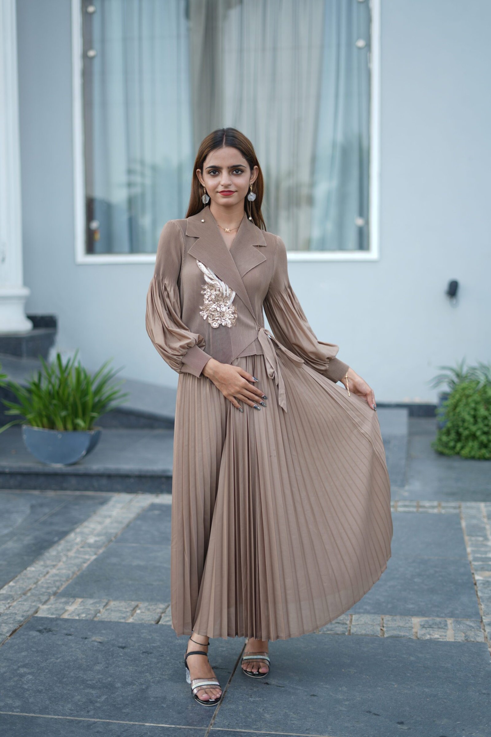 Step into effortless elegance with this embroidered pleated wrap dress for women, designed for modern festive dressing, evening parties, and sophisticated celebrations. This one-piece dress blends contemporary tailoring with delicate embellishments, creating a refined yet graceful silhouette.