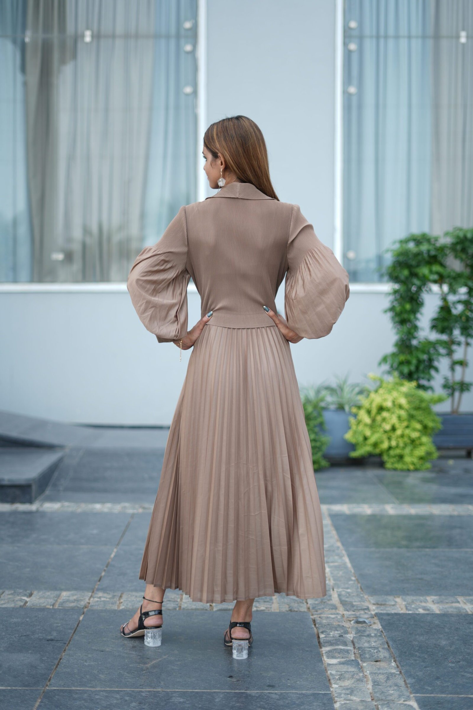 Statement Puff Sleeves – Designed with long puff sleeves and softly gathered cuffs, the dress brings volume and drama while maintaining a balanced, feminine look. The sleeves elevate the overall silhouette, making it perfect for special occasions.