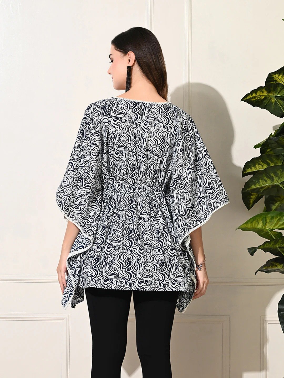 This stylish kaftan-style top features a black and white abstract print with a relaxed, flowy silhouette. The V-neckline and wide sleeves are enhanced with delicate lace detailing, adding a feminine and elegant touch. A drawstring at the waist cinches the fit, offering both comfort and shape. Perfect for casual outings or relaxed gatherings, this top blends effortless style with subtle sophistication.