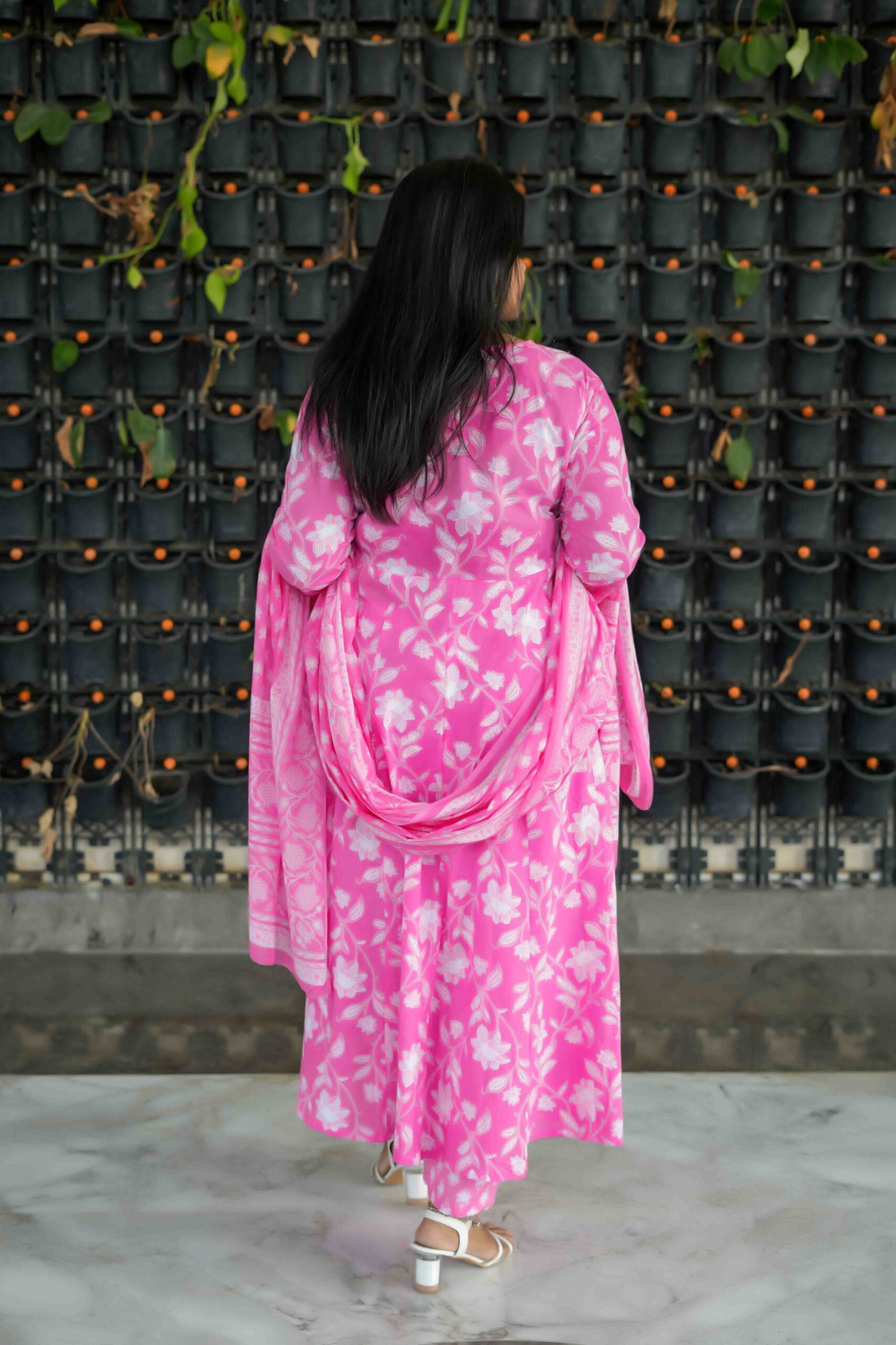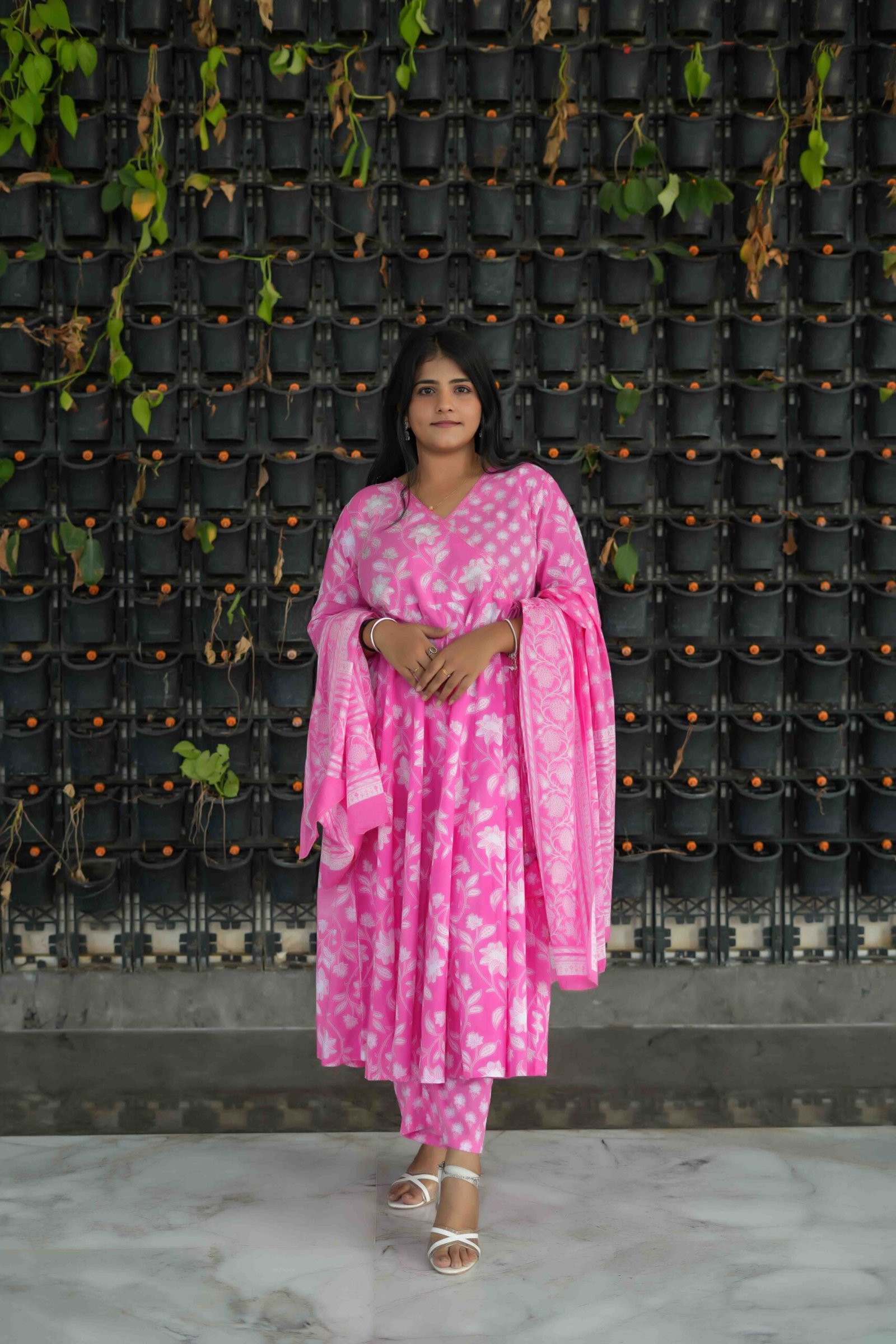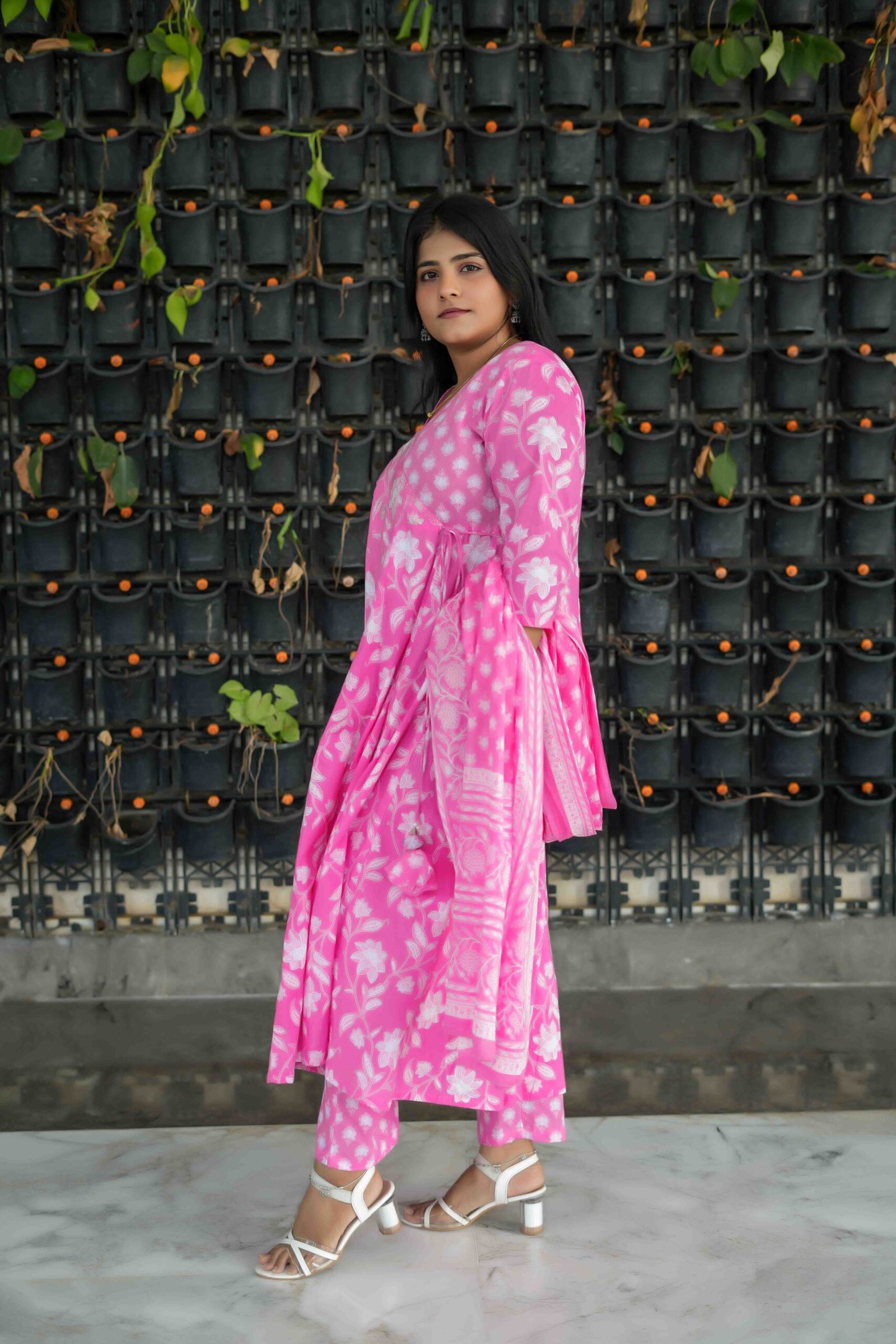 Gracefully styled in an Angrakha silhouette, this soft pink ethnic dress features zari work floral detailing that adds a subtle shimmer. The flowy kurta is paired with a matching printed bottom and dupatta, creating a classic and elegant look perfect for festive or semi-formal occasions.