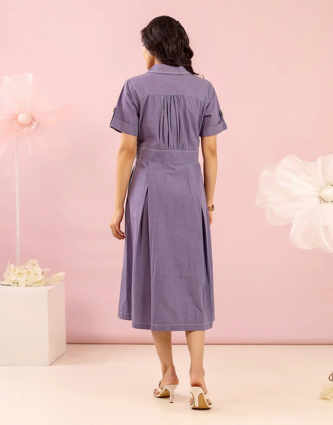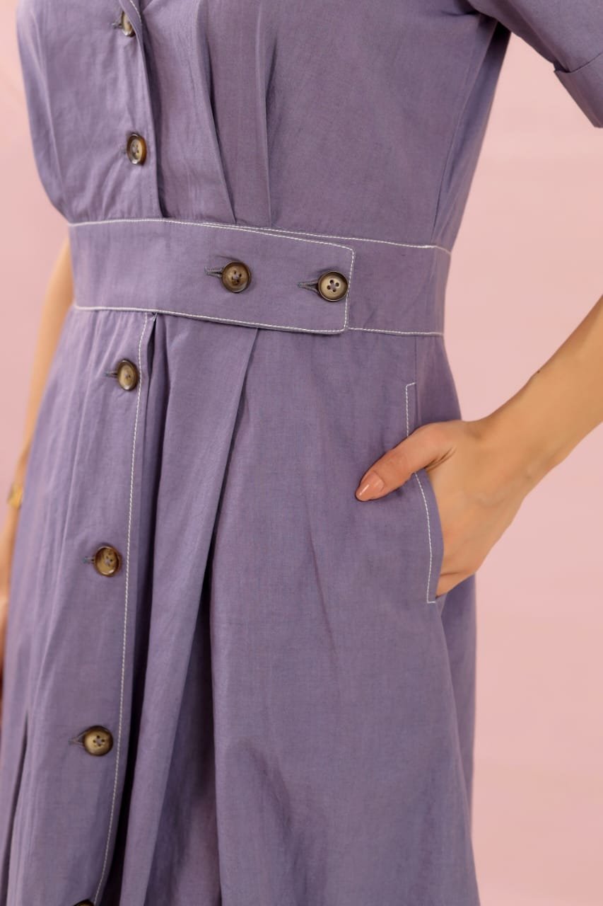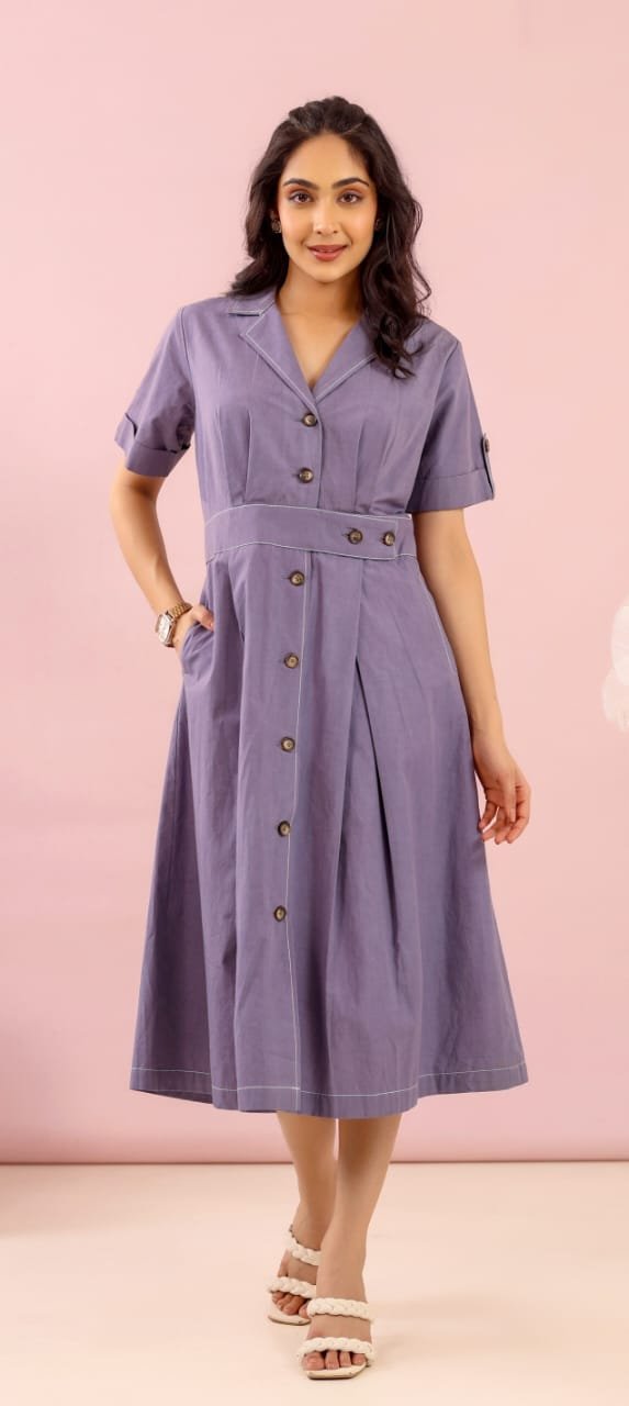 A chic denim-look midi dress featuring a tailored button-down front, wide belted waist with button detail, soft pleats, and handy side pockets. Perfect blend of casual and classy.