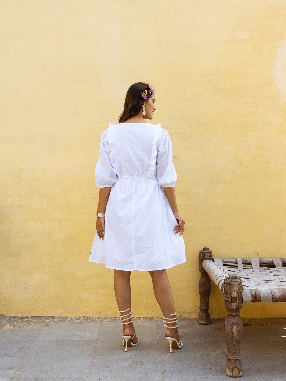 This is a white A-line dress featuring intricate floral thread embroidery and delicate frill detailing on the yoke. The design includes a lace-up neckline with tassels, puffed three-quarter sleeves, and scattered floral motifs on the body, giving it a breezy, feminine, and bohemian-inspired appeal.
