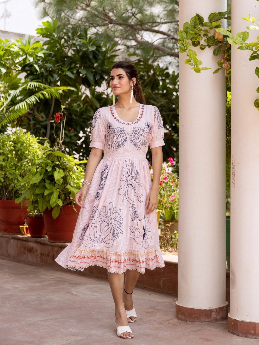 This is a soft pink flared seer sucker midi dress featuring bold floral thread embroidery in navy and coral tones. The dress includes a rounded neckline with scalloped embroidery, gathered detailing at the waist for a flattering silhouette, and tiered hem with contrast stitching for added texture and charm.