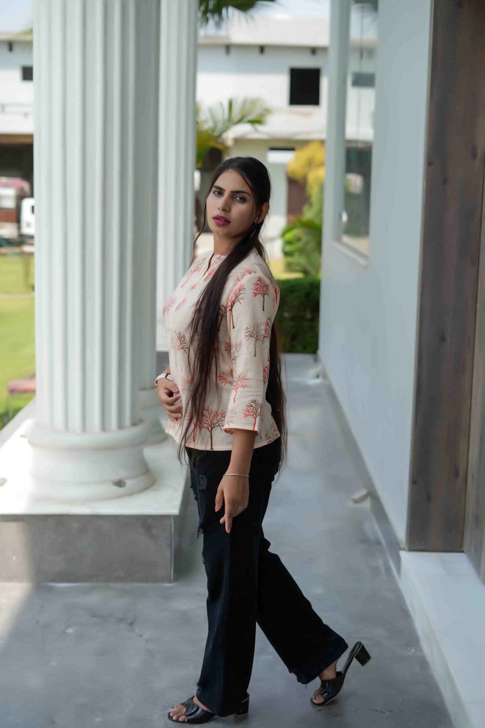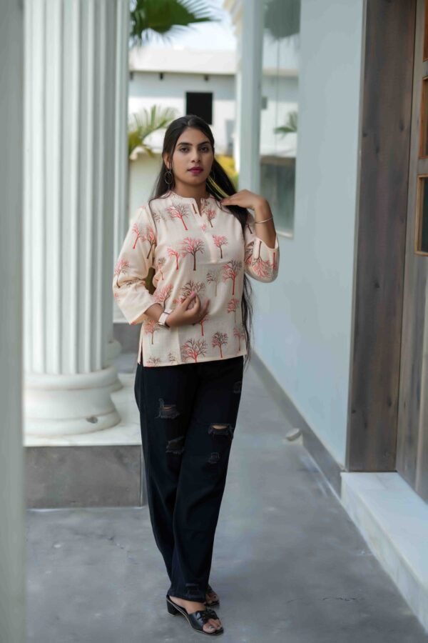 Elevate your casual wardrobe with this warm cream top featuring a delicate tree print in earthy red and brown tones. The fabric has a soft peach undertone that adds warmth and uniqueness to the look. Designed with a notched neckline and 3/4th sleeves, this top pairs effortlessly with denim or leggings for an easy everyday outfit with a touch of charm.