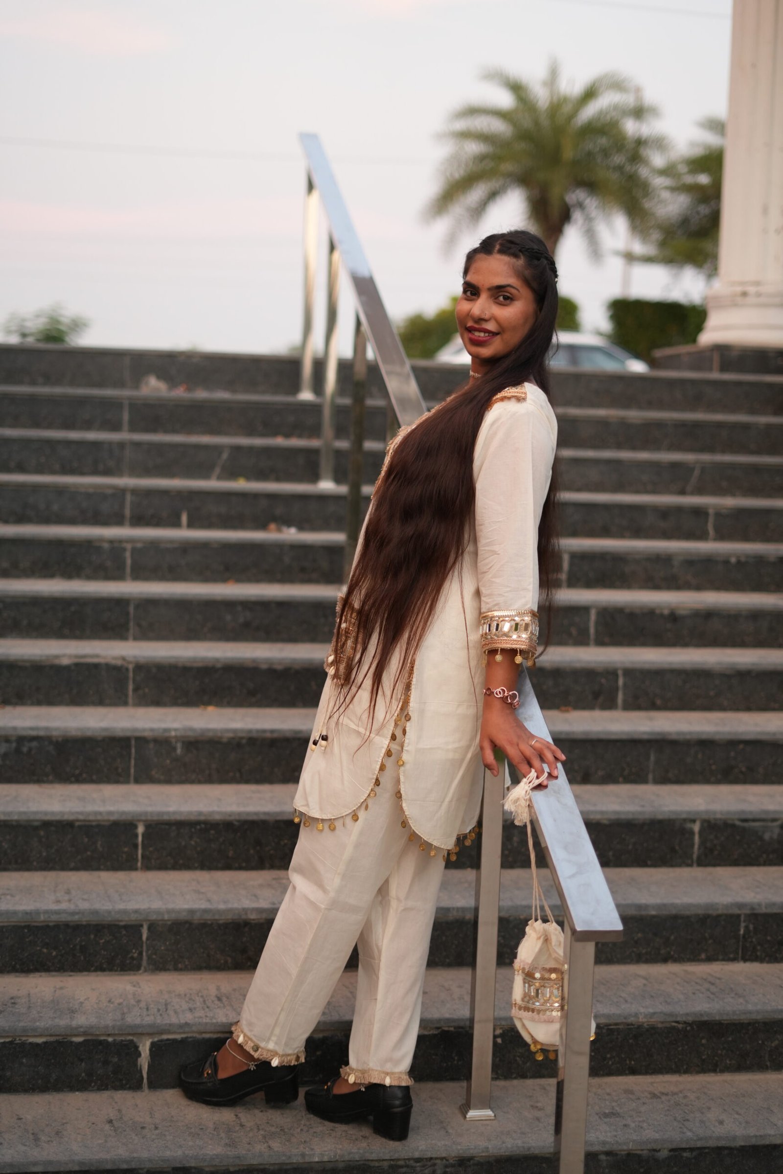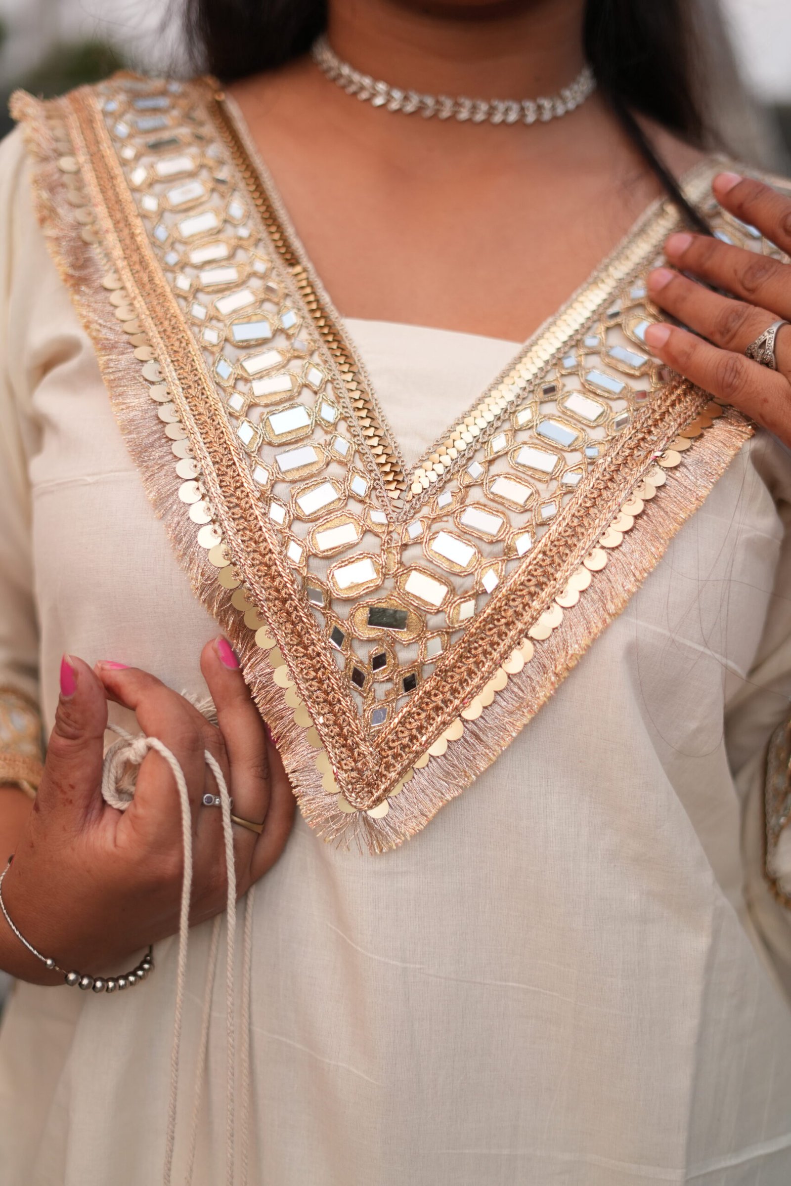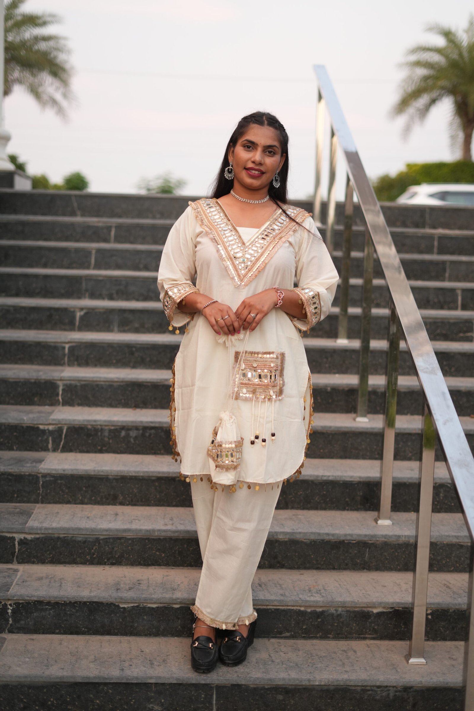 Elegant cream kurta set with mirror work, pants & potli bag. Perfect festive & wedding wear for women in premium fabric.