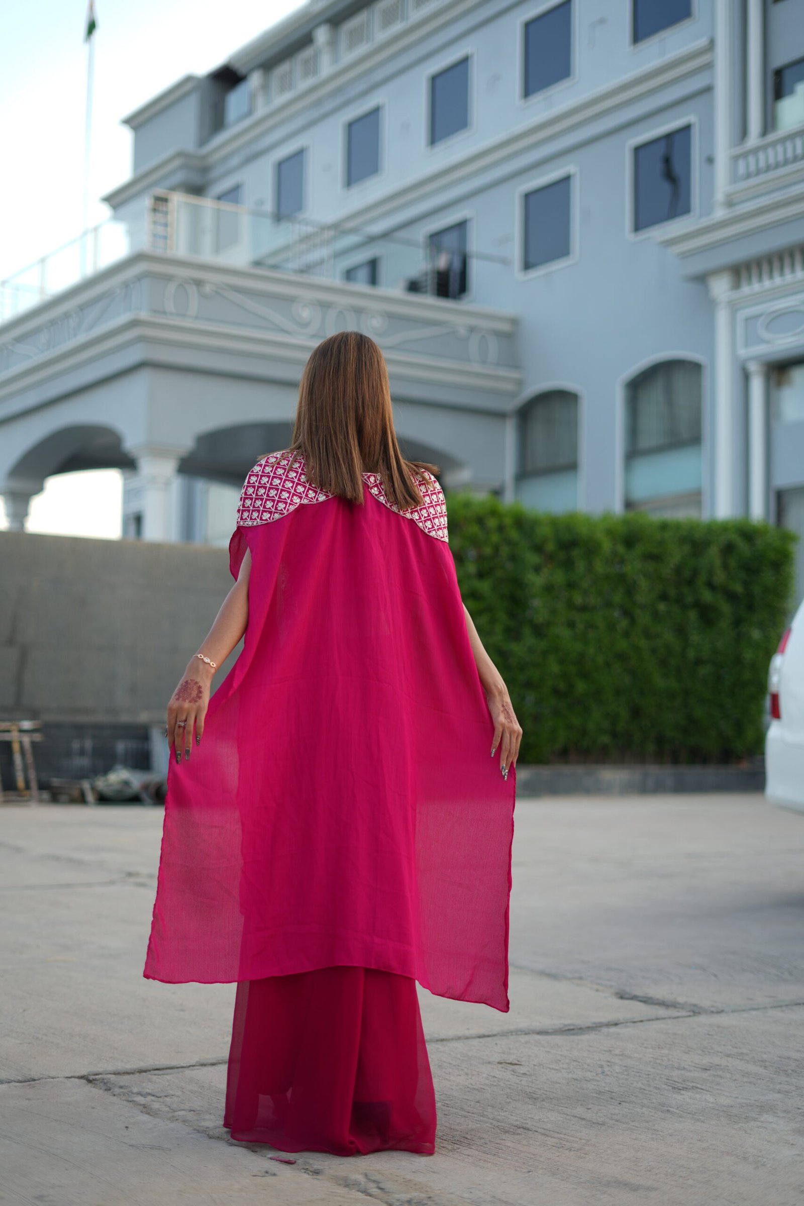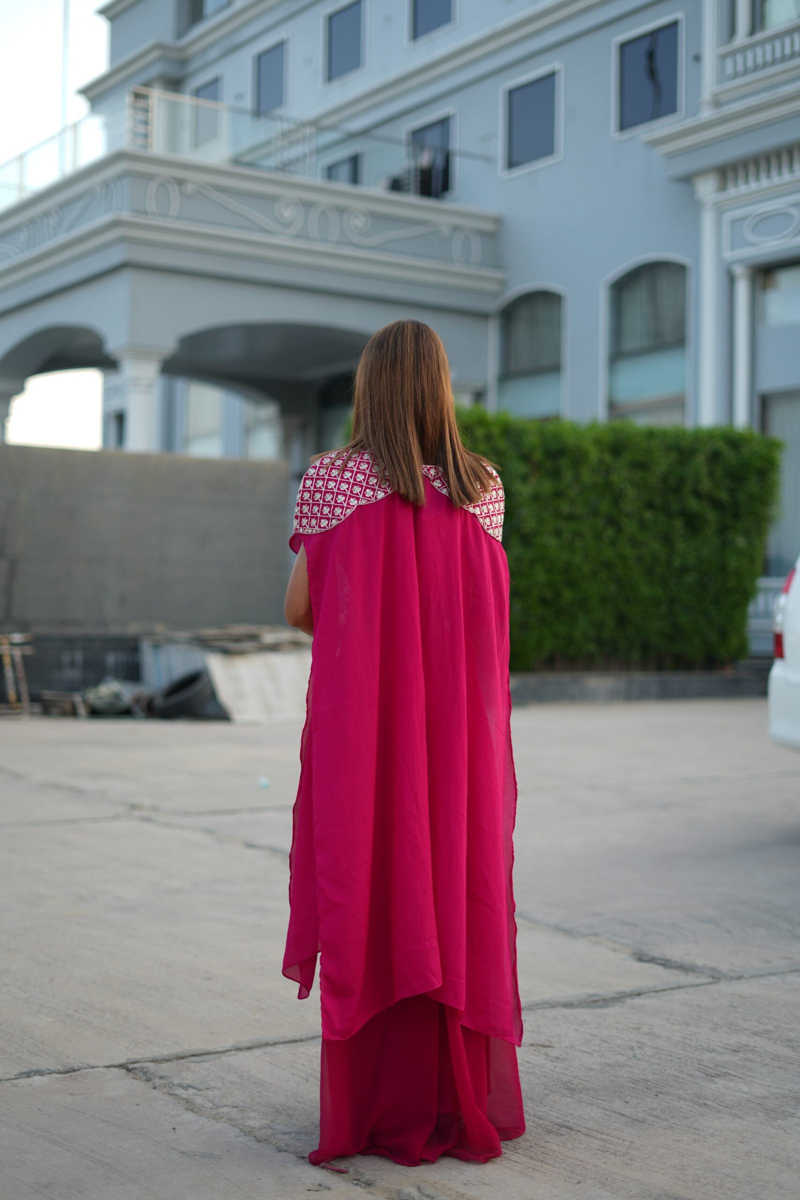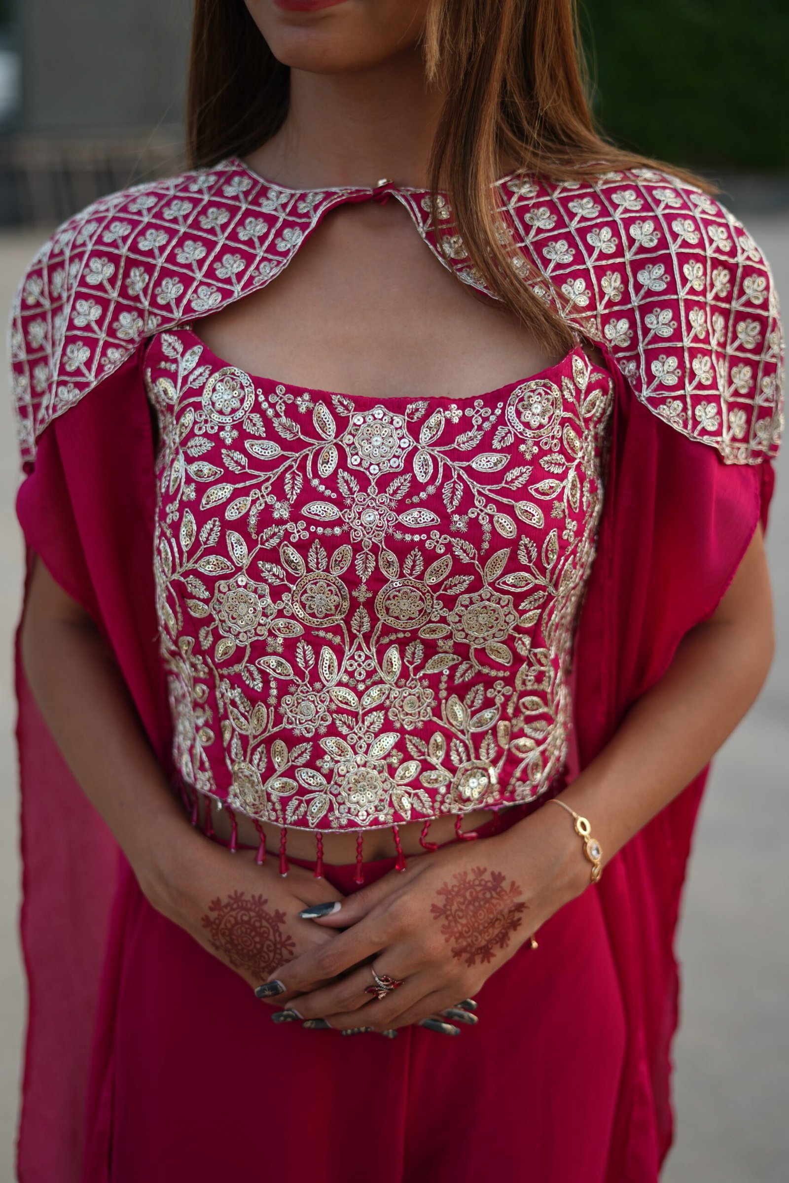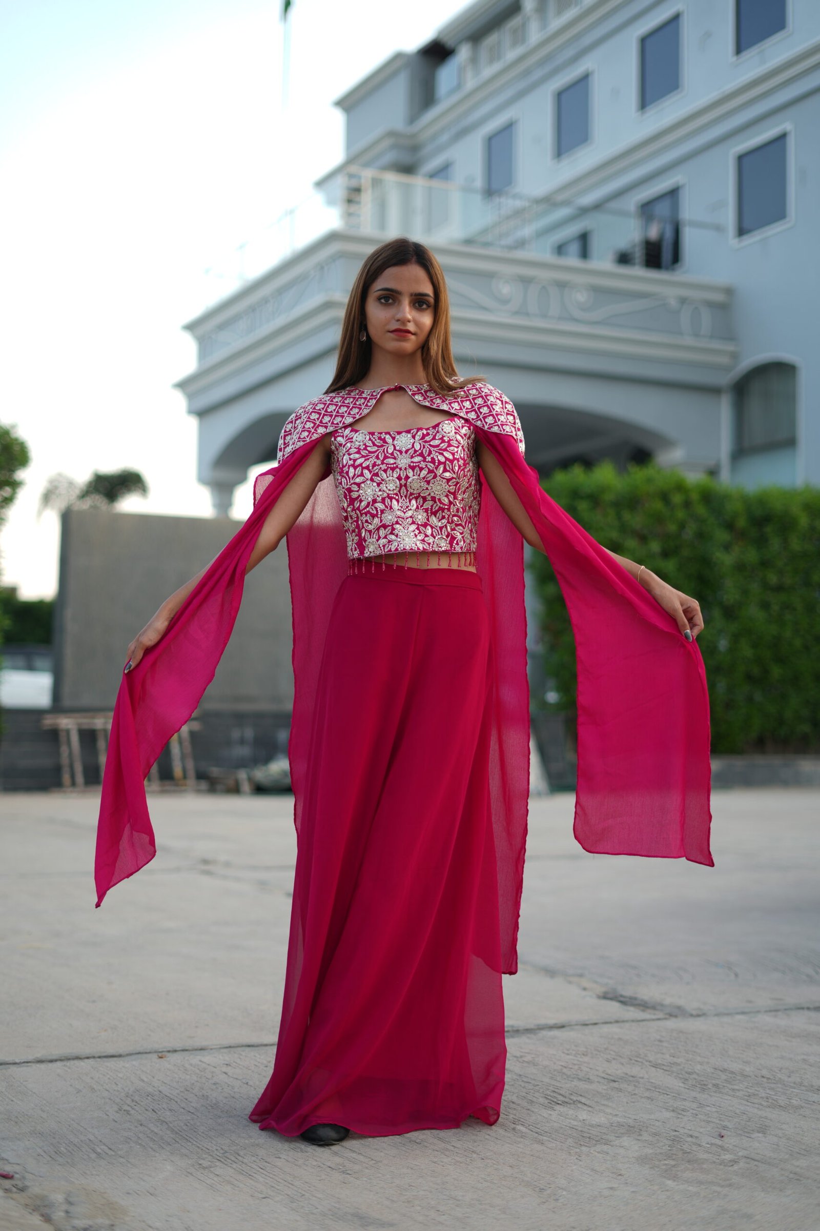 Cape/Drape: A unique cape-style dupatta in sheer Red fabric with embroidered shoulder detailing, adding a regal and fashion-forward vibe.
