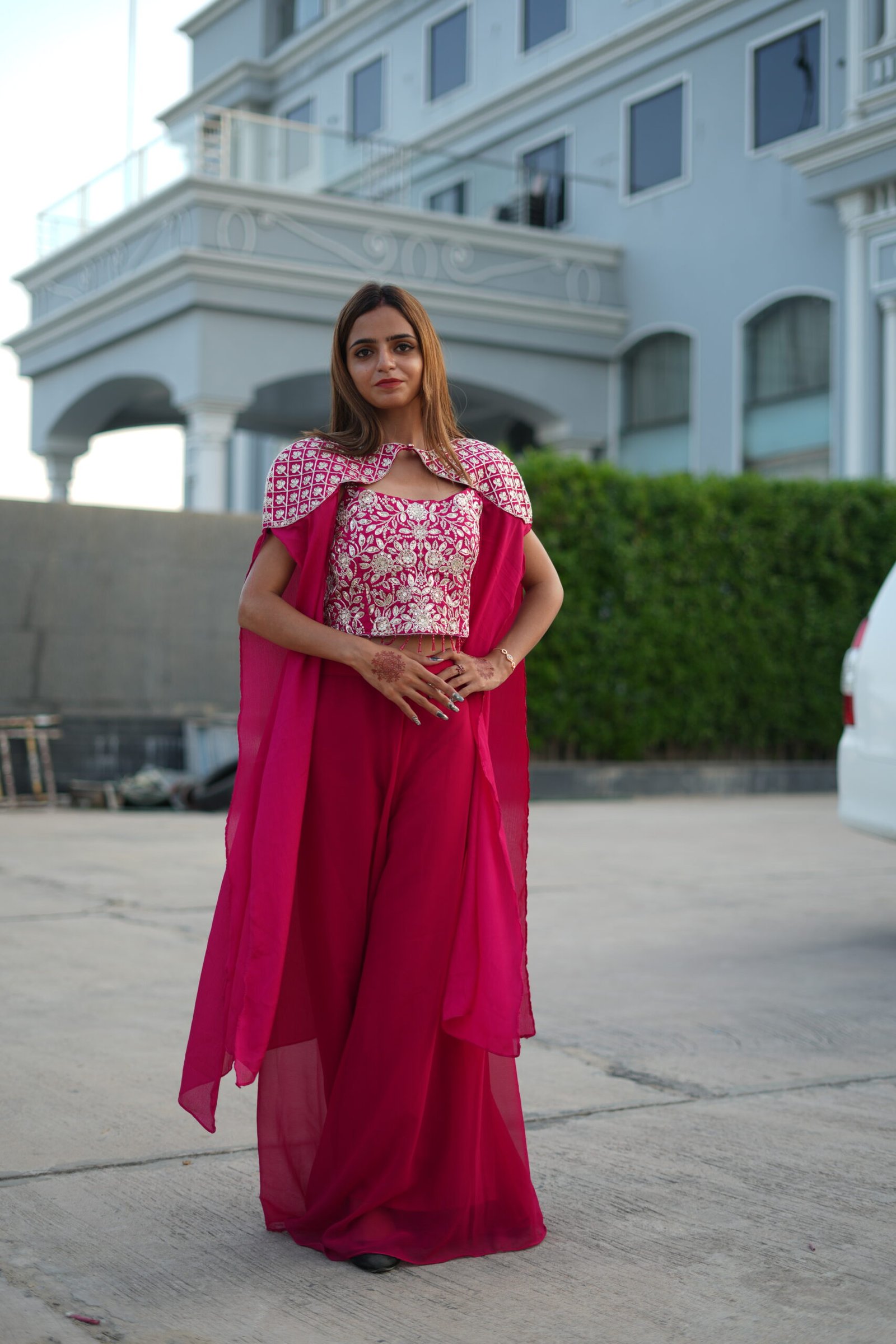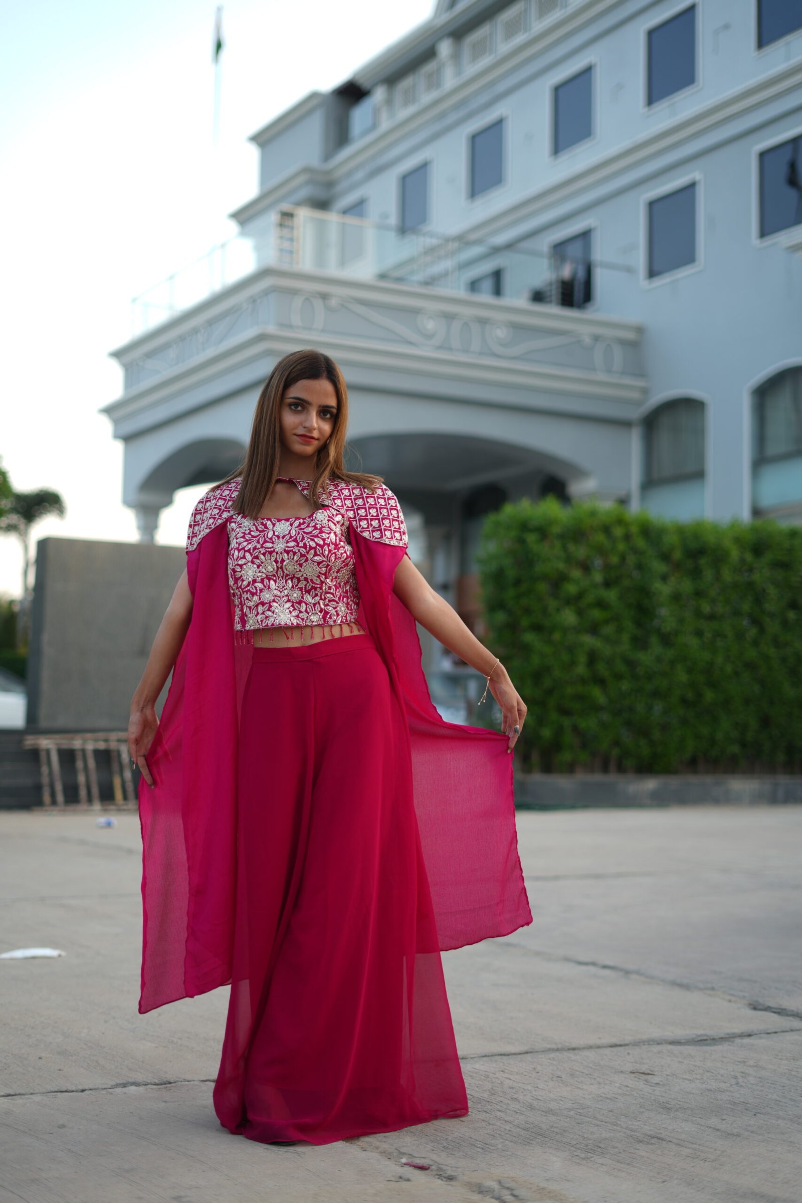 Step into elegance with this stunning Red designer ethnic set, perfect for weddings, festive occasions, parties, and receptions. The outfit features a heavily embroidered crop top blouse with intricate silver thread and sequin work, paired with a flowy palazzo pant and a stylish cape dupatta that adds a modern twist to traditional wear.