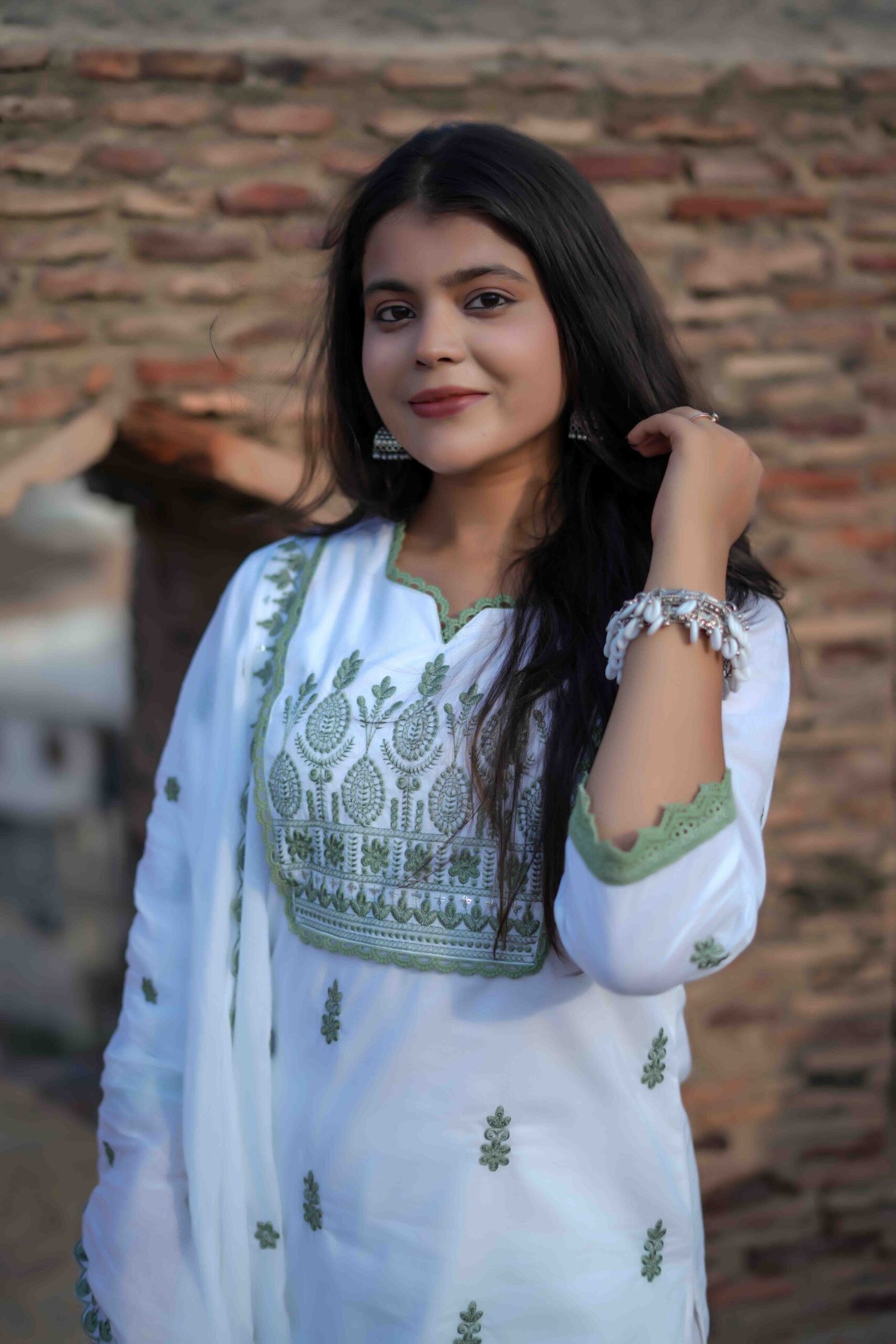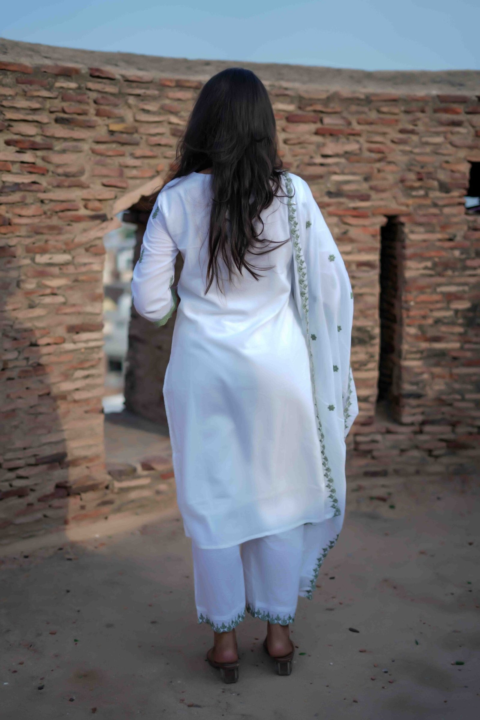 This elegant white ethnic suit set features light green thread embroidery with subtle sequin detailing that adds a touch of shimmer. The green lace accents on the neckline, sleeves, and dupatta borders enhance the traditional charm. Scattered embroidered motifs throughout the fabric complete the graceful and festive look — perfect for daytime celebrations or semi-formal gatherings.
