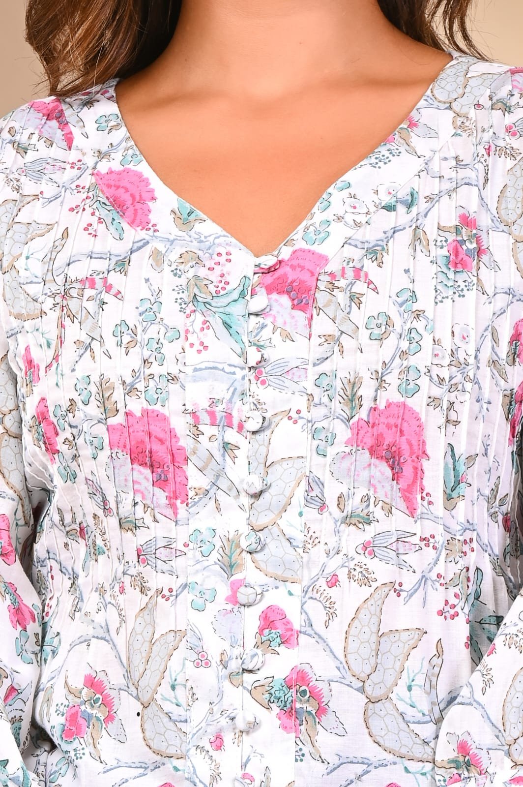Soft pastel floral printed cotton tunic with pintuck detailing on the front. Features a V-neckline and 3/4th sleeves, ideal for a breezy and comfortable casual look.