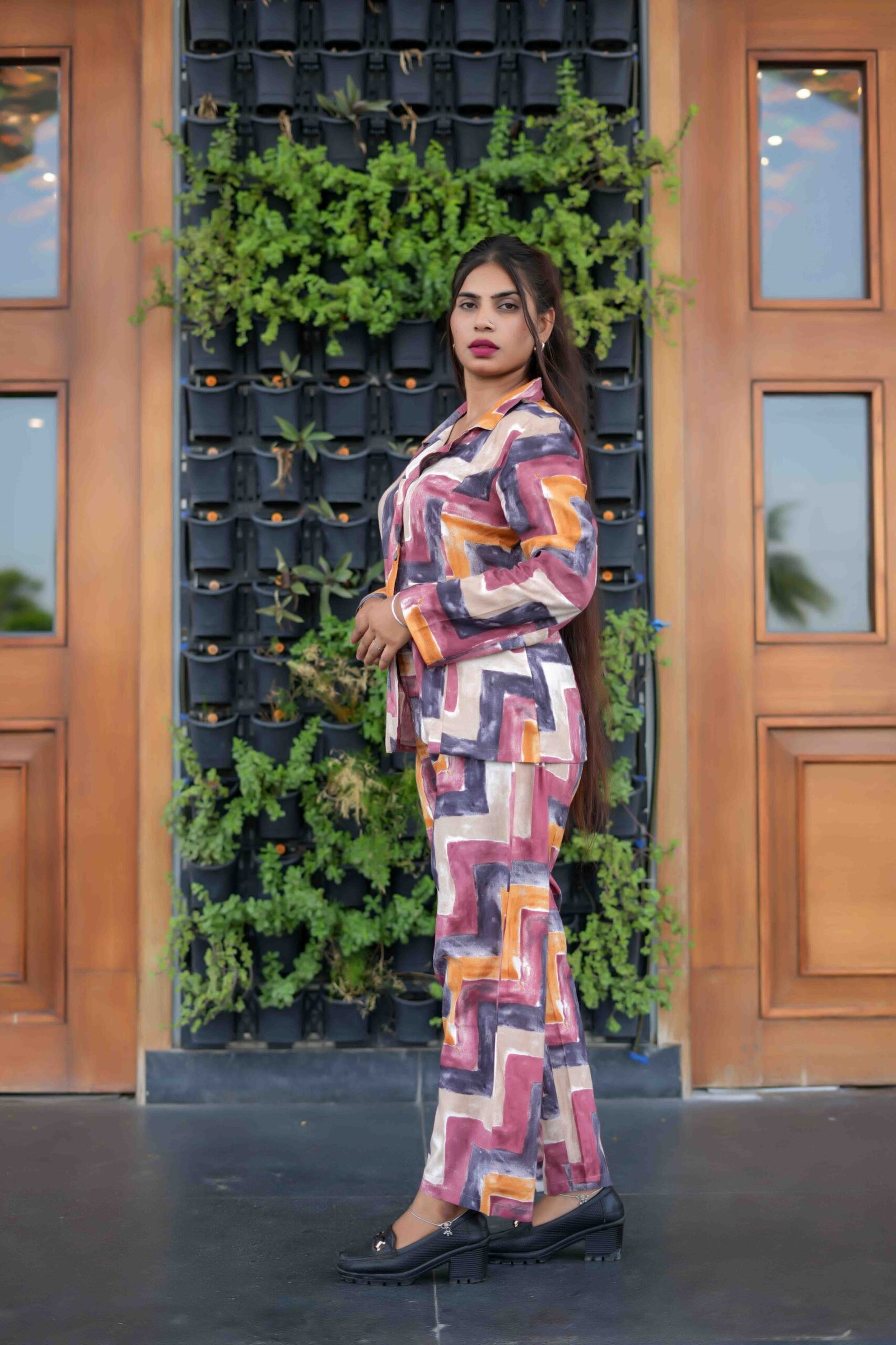 This outfit is a bold multicolor zigzag printed coord set featuring a collared blazer-style top with long sleeves and matching straight-fit trousers. The vibrant mix of warm tones—like rust, mustard, beige, and charcoal—adds a lively, modern edge, perfect for both casual and semi-formal looks.