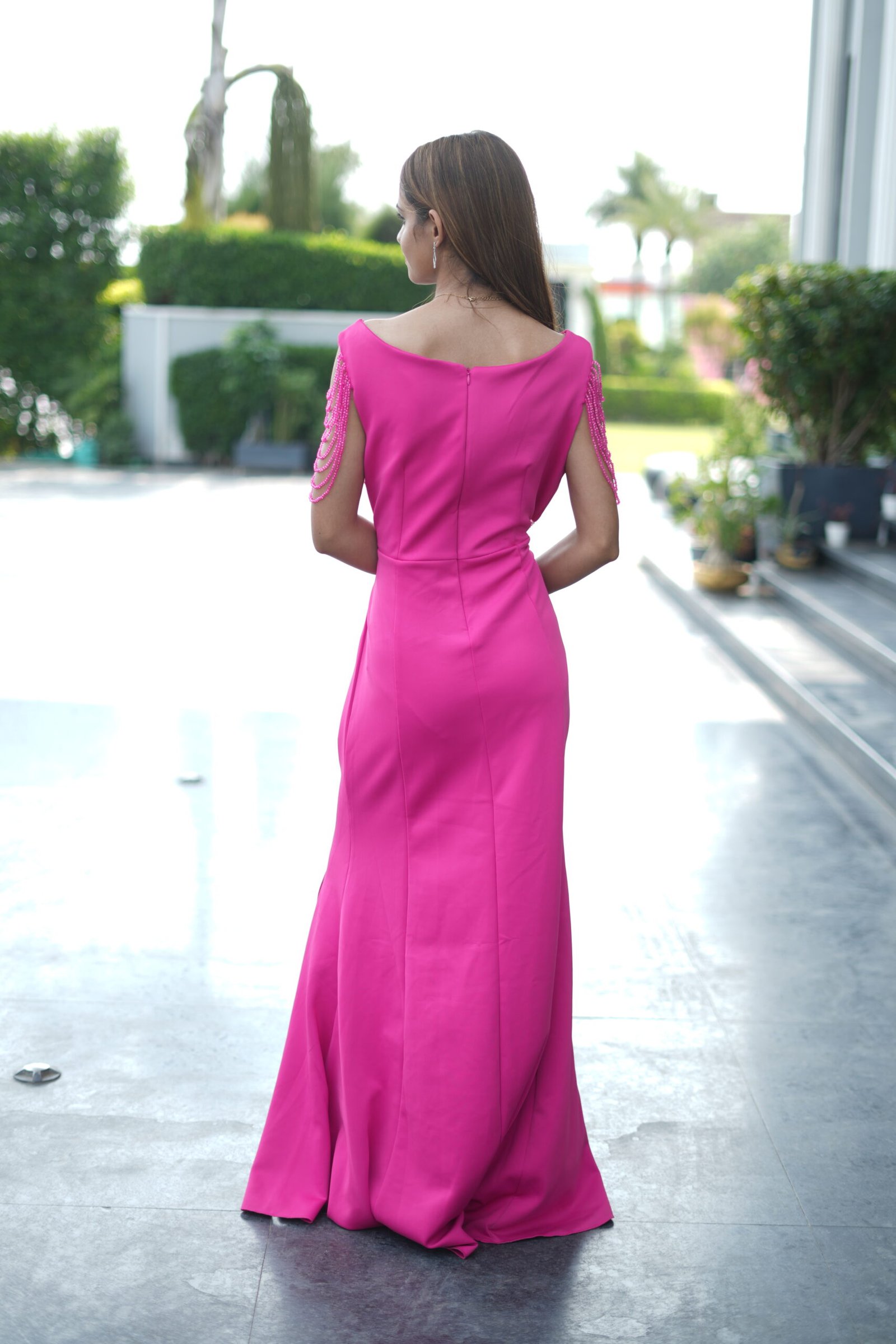 Hot Pink Embellished Gown with Beaded Sleeves & Sheer Detailing – Elegant Evening Dress