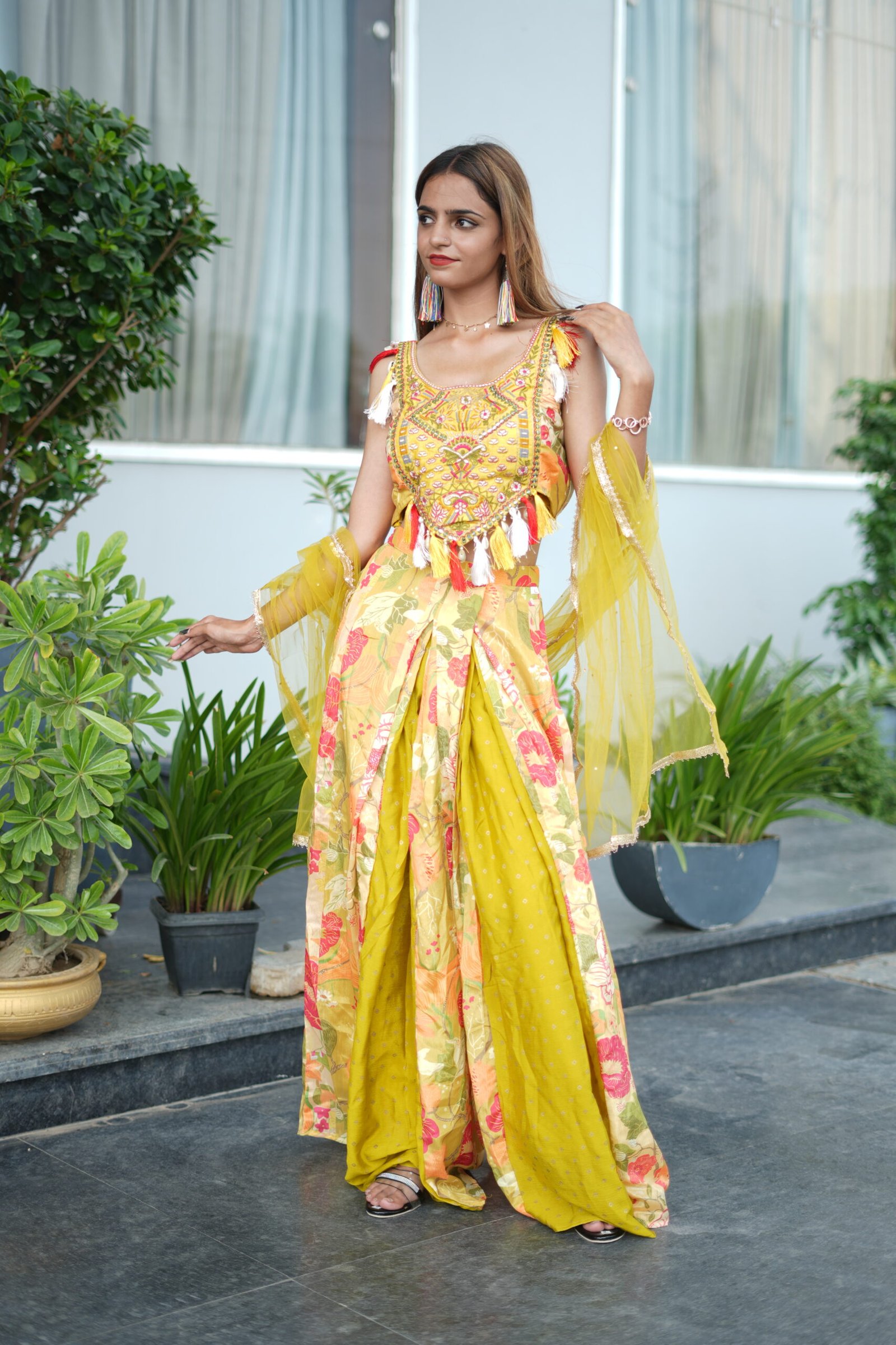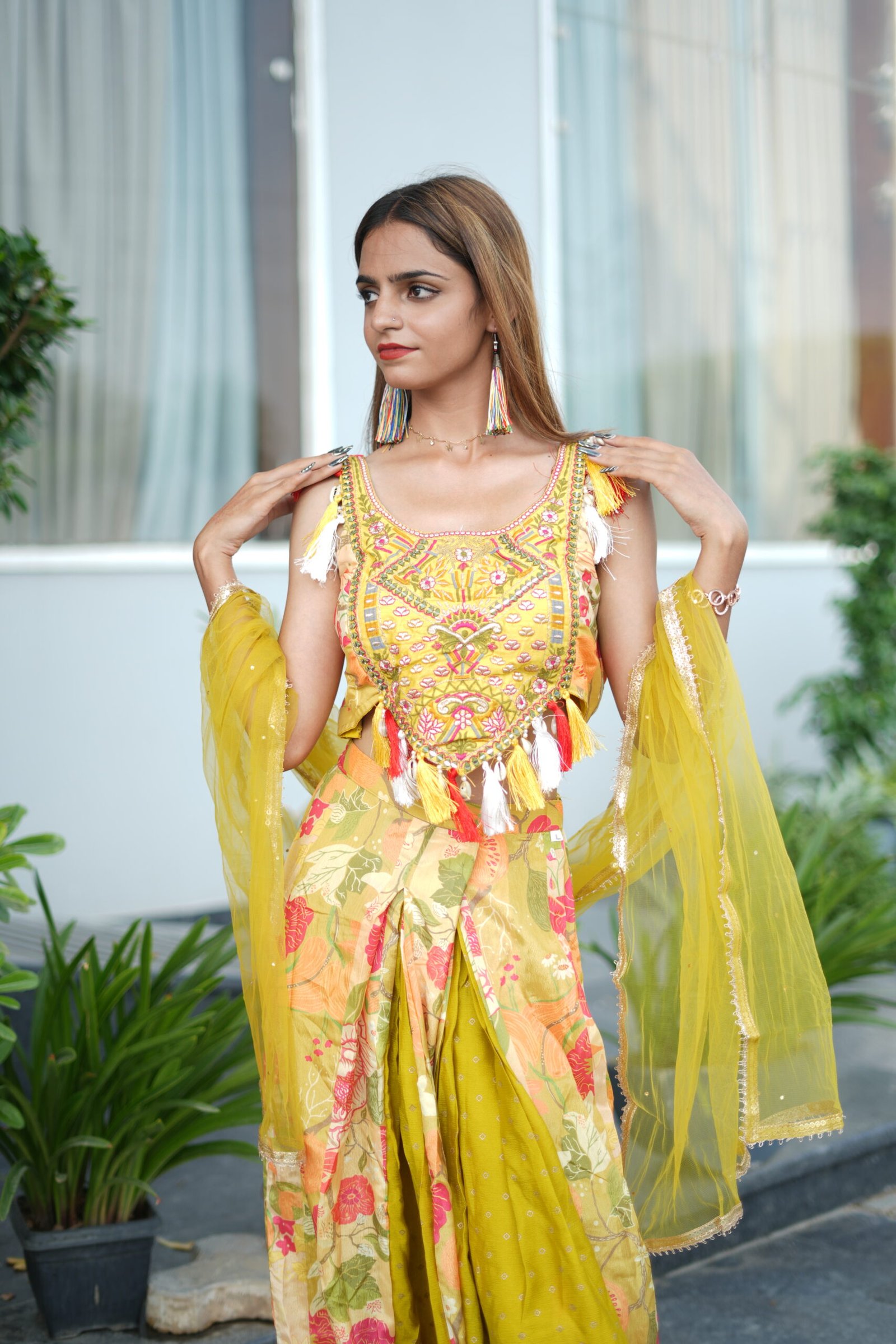 Brighten up your ethnic wardrobe with this yellow floral embroidered outfit, a stylish choice for weddings, haldi, mehndi, and festive celebrations. The embroidered crop top is beautifully crafted with intricate mirror work, colorful thread embroidery, and tassel detailing for a chic yet traditional appeal.
