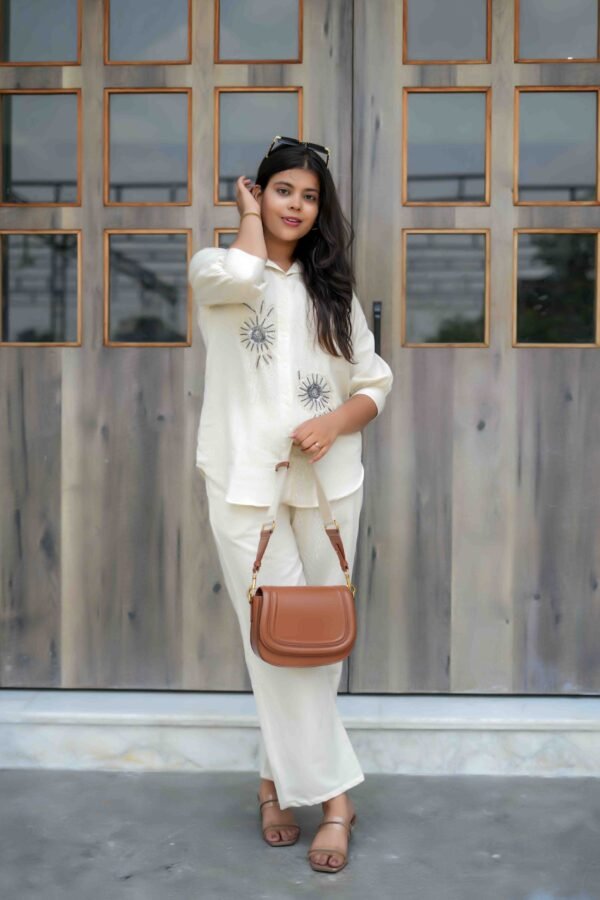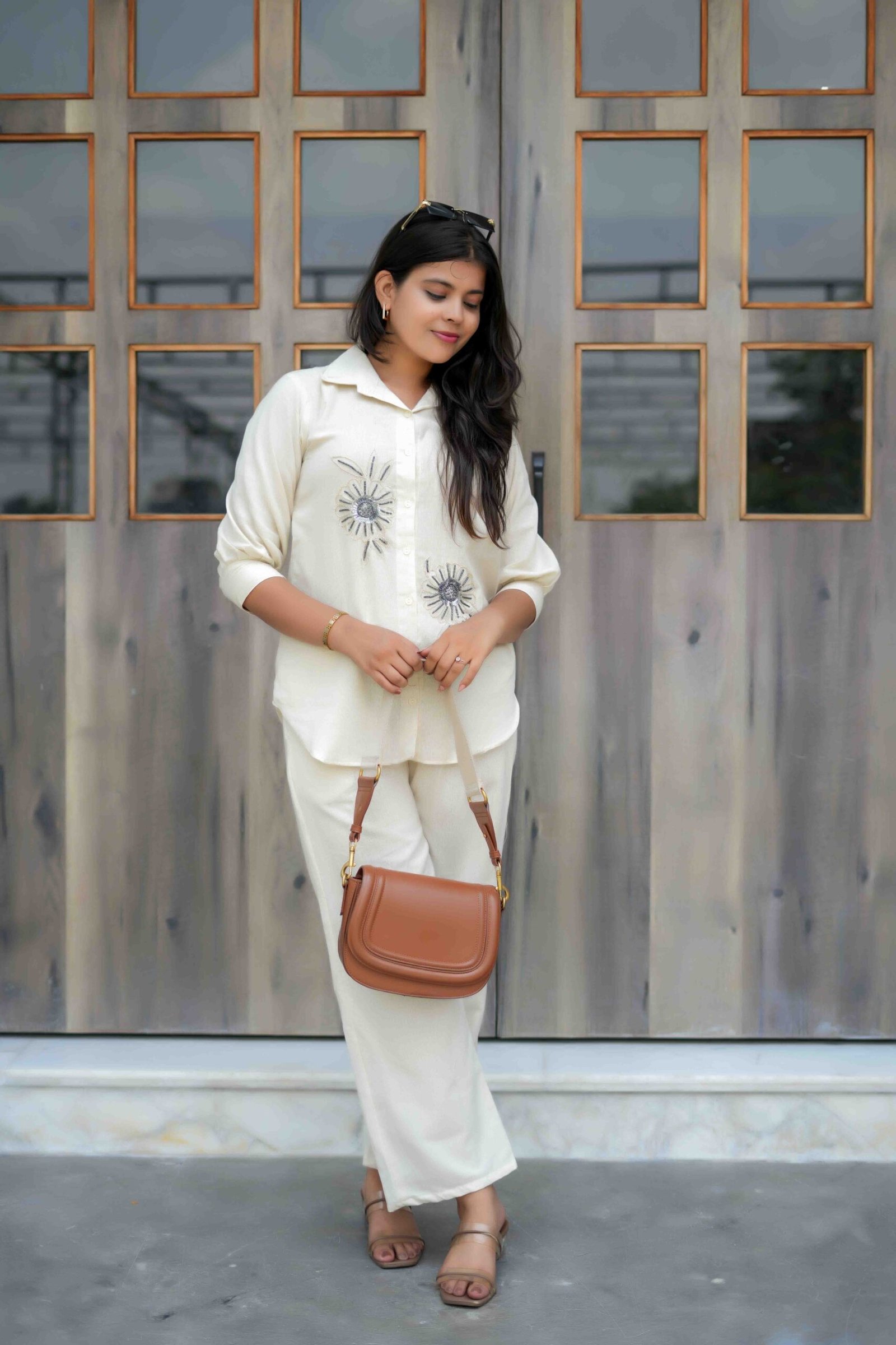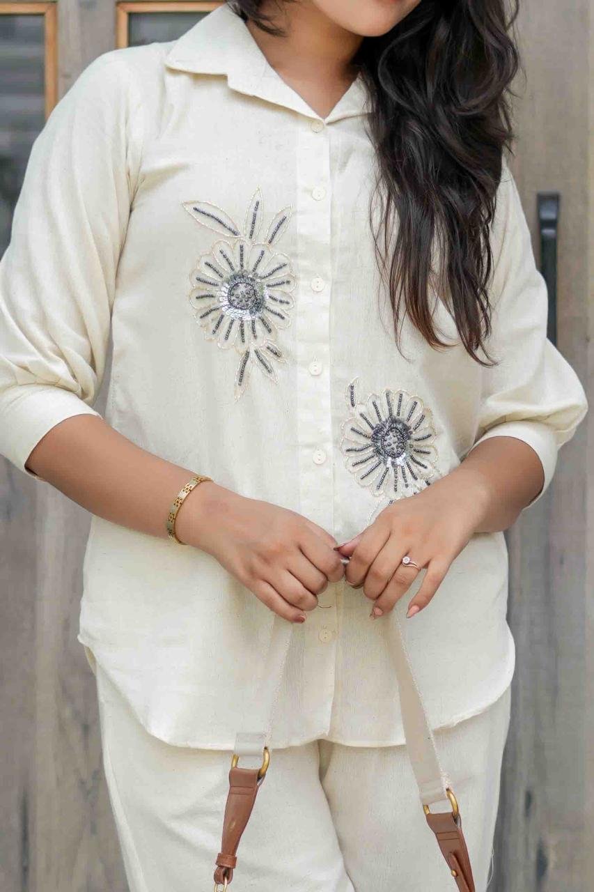 This graceful ivory co-ord set is crafted from a smooth, flowy fabric and features detailed beadwork embroidery in floral motifs on the front. The delicate beading adds a touch of shimmer and elegance. Paired with relaxed straight pants, this set blends sophistication with comfort—ideal for daytime outings or casual events.