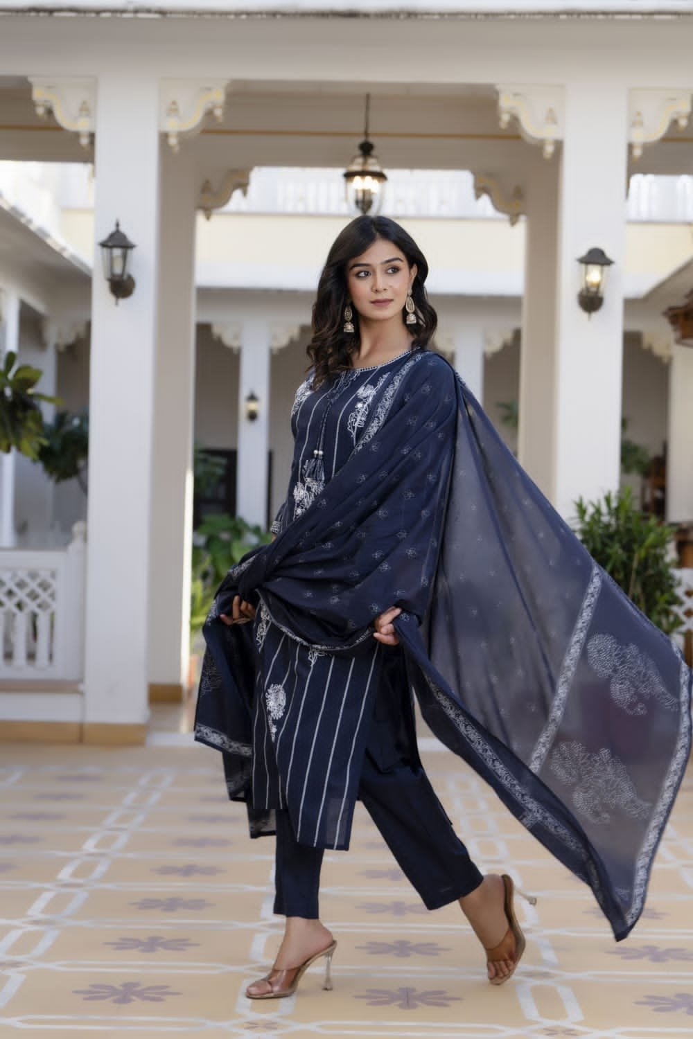 Elegant blue-colored kurta set featuring mirror-embroidered floral motifs and kantha-style vertical prints  , neck detailing with dori and tassel , paired with matching solid pants and a printed dupatta with coordinated floral detailing. A graceful and festive ensemble with traditional charm.