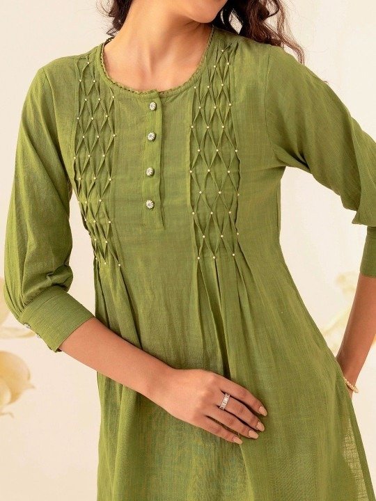 Olive green cotton kurta set featuring intricate pintuck detailing on the front yoke, embroidered buttons, and delicate lace trim on the hem and sleeves. Paired with matching straight pants for a comfortable and elegant look.