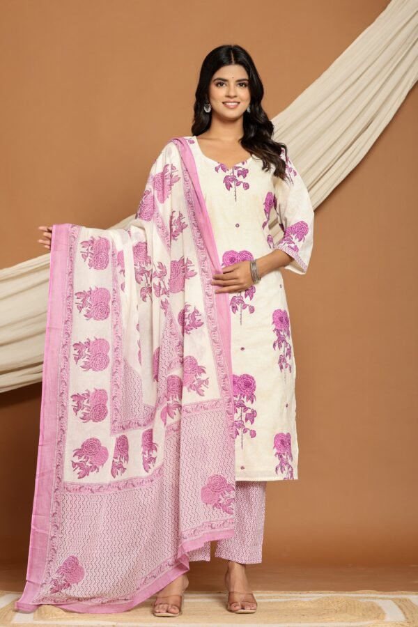 A soft cream kurta set featuring bold floral motifs enhanced with intricate thread embroidery, subtle zari highlights, and delicate mirror work. The fabric also has an elegant self-weave pattern in the background, adding texture and richness. Paired with printed pants and a matching dupatta for a refined festive look.
