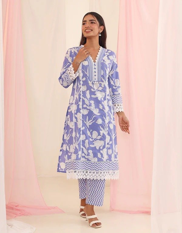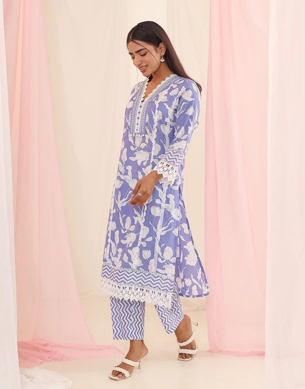 This breezy blue kurta set features bold white floral prints with intricate lace detailing on the neckline, sleeves, and hem. The V-neck is accented with embroidery for added charm, while the kurta is paired with a matching chevron-printed pant for a coordinated and stylish look—perfect for effortless everyday elegance.