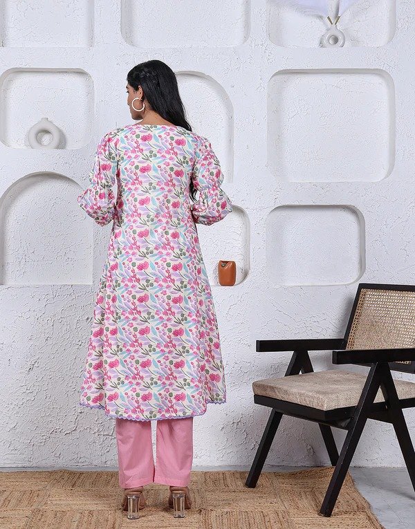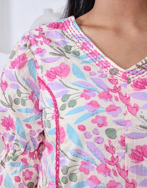 Elegant floral printed kurta featuring princess line paneling enhanced with lace detailing . The V-neckline is adorned with fine kantha stitch embroidery The puffed sleeves with gathered cuffs add a soft, feminine touch, making it perfect for casual outings or festive gatherings. A perfect blend of tradition and subtle charm.