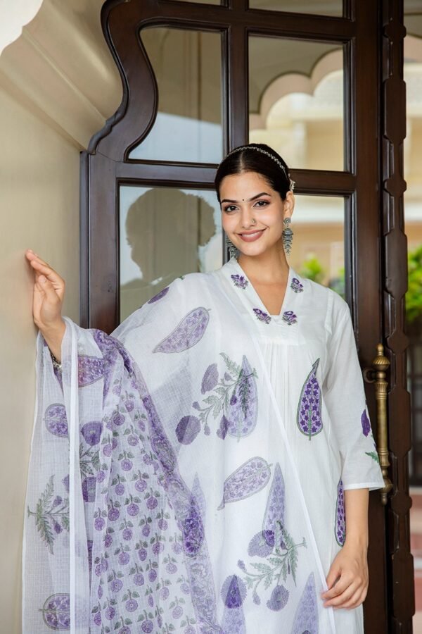 A graceful block-printed kurta set in white with purple motifs, featuring a soft V-slit neckline with fine pleat detailing for a refined touch. Paired with printed straight pant  and a lightweight Cotton Kota Doria dupatta showcasing coordinated block prints. Perfect for summer elegance and light festive wear.