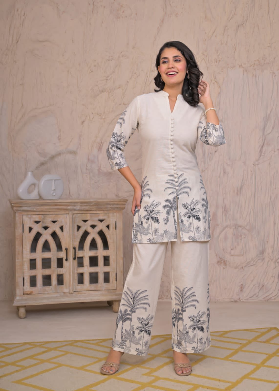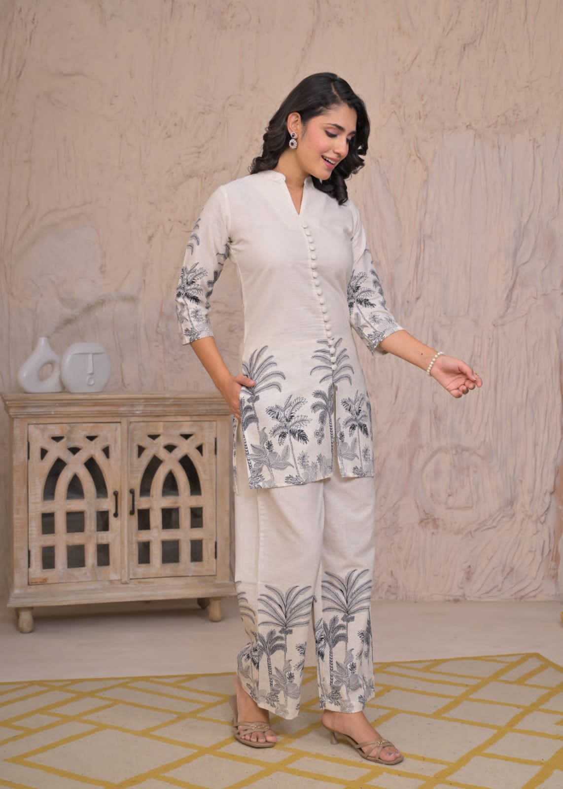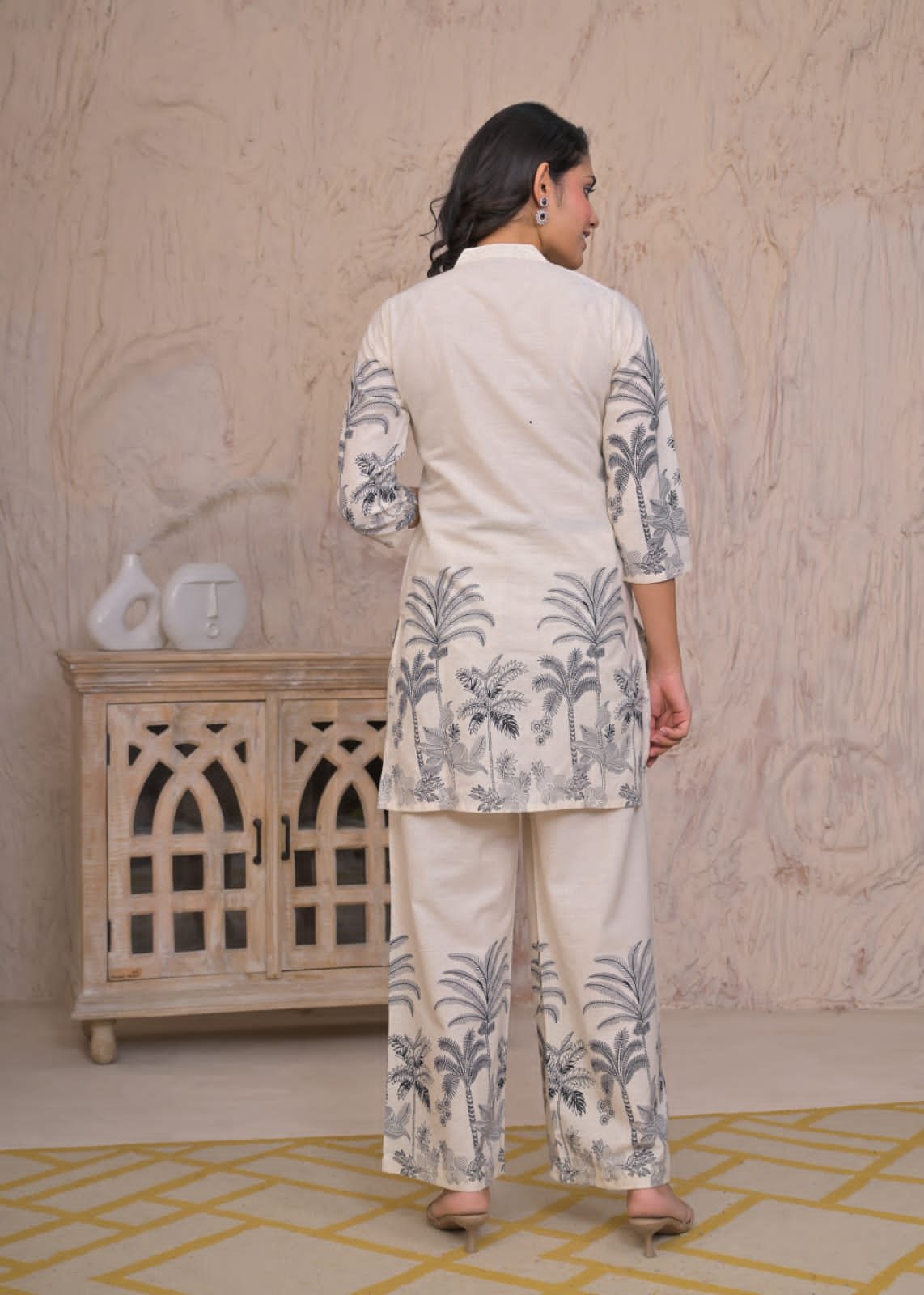 Elegant white coord set featuring intricate black palm tree prints on the sleeves, hemline, and pant borders. The straight kurta has a buttoned front with a mandarin collar and is paired with matching wide-leg trousers, creating a breezy and sophisticated look.