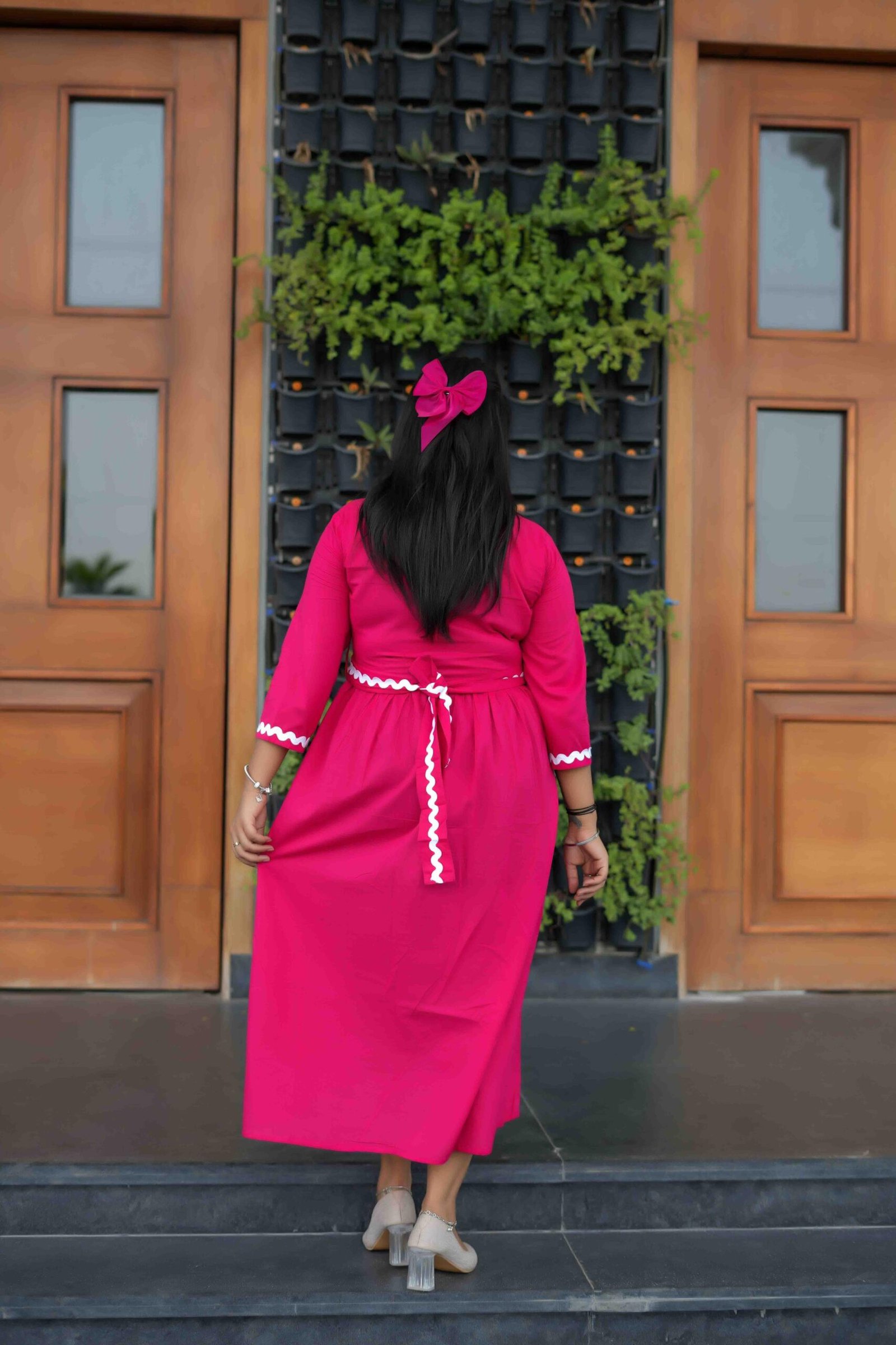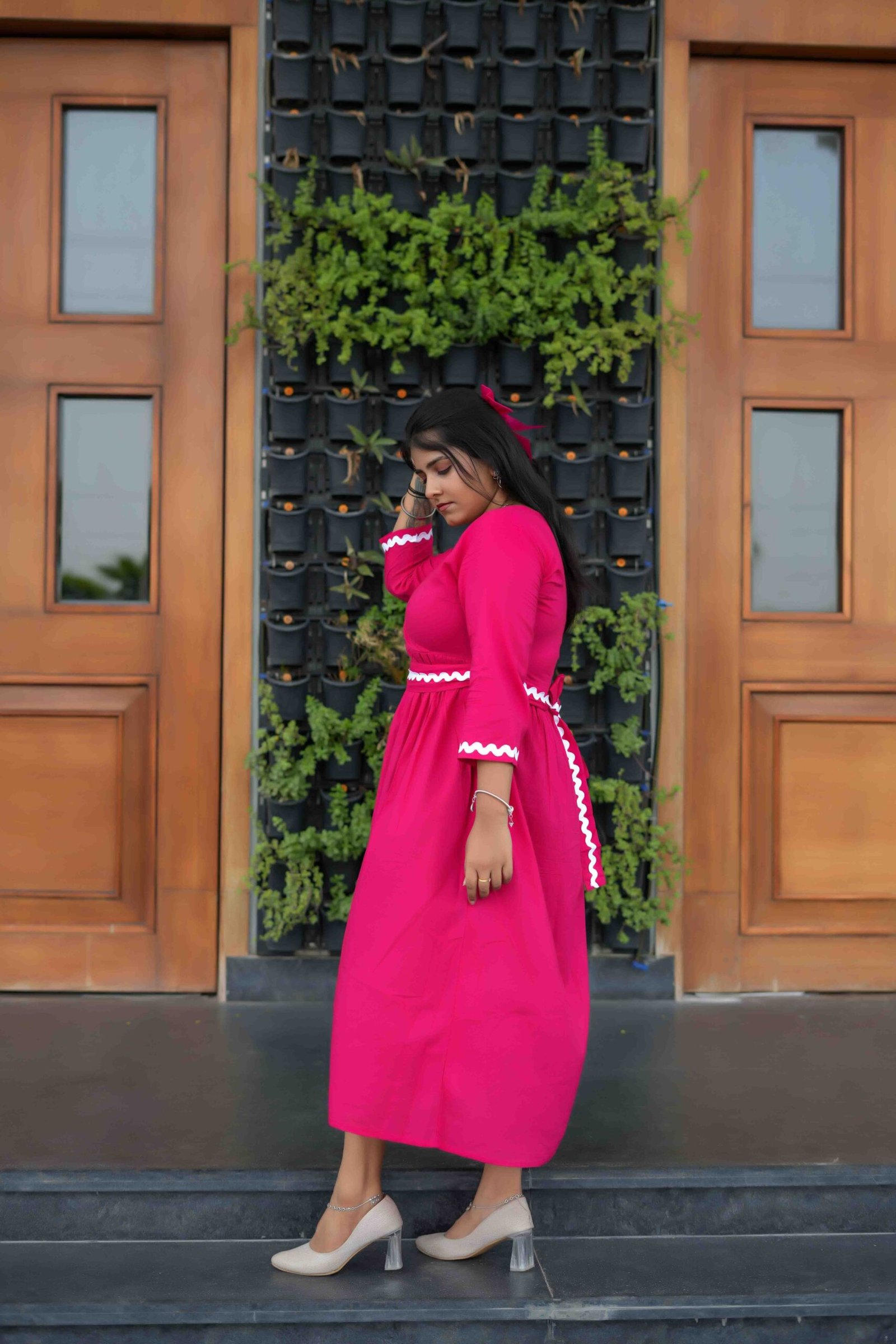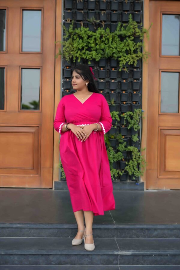 Elegant and charming, this pink flared midi dress features a flattering V-neckline, 3/4th sleeves, and white zigzag lace detailing on the cuffs and waist. A perfect blend of comfort and feminine grace, ideal for casual outings or brunch dates.