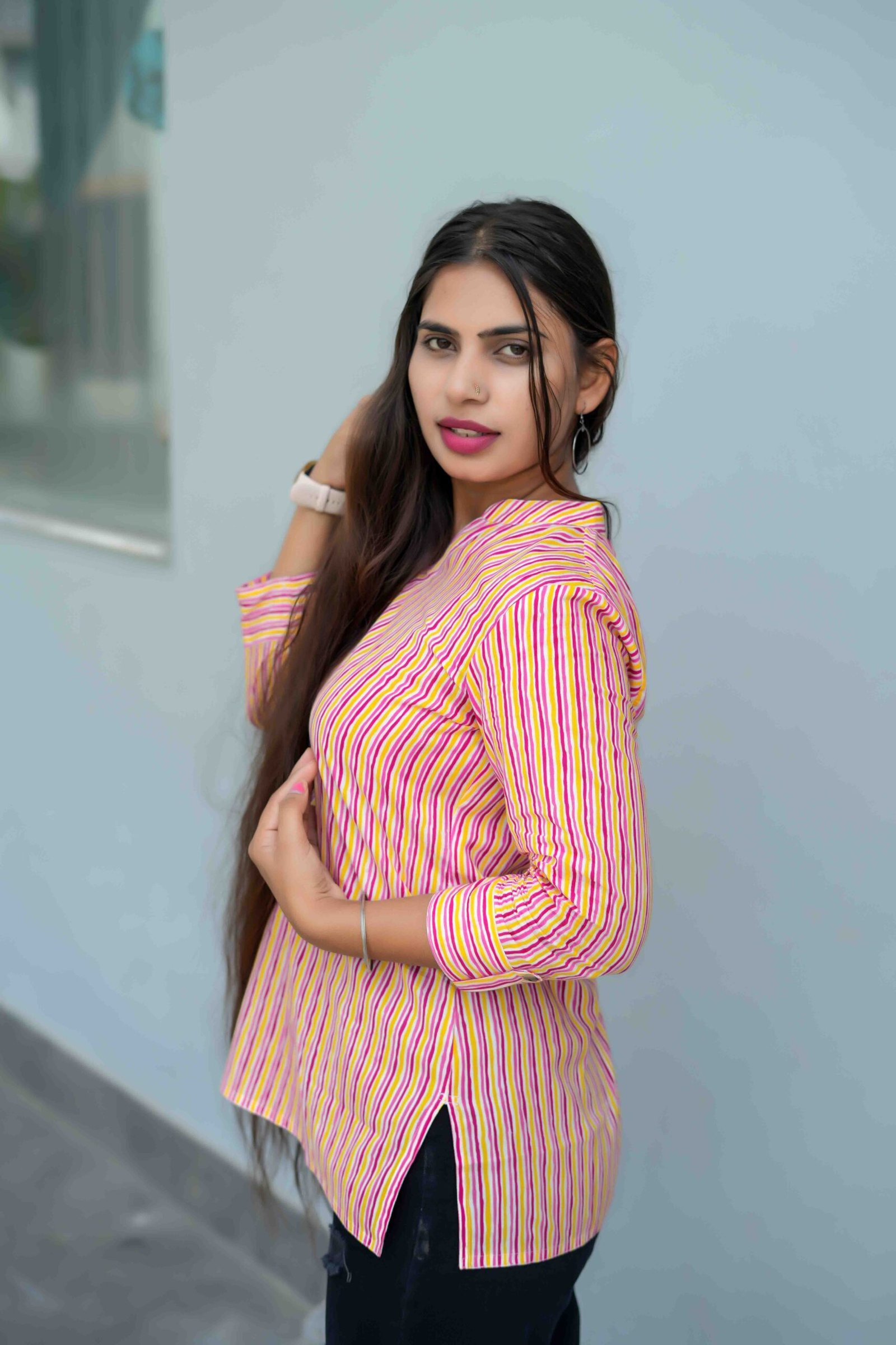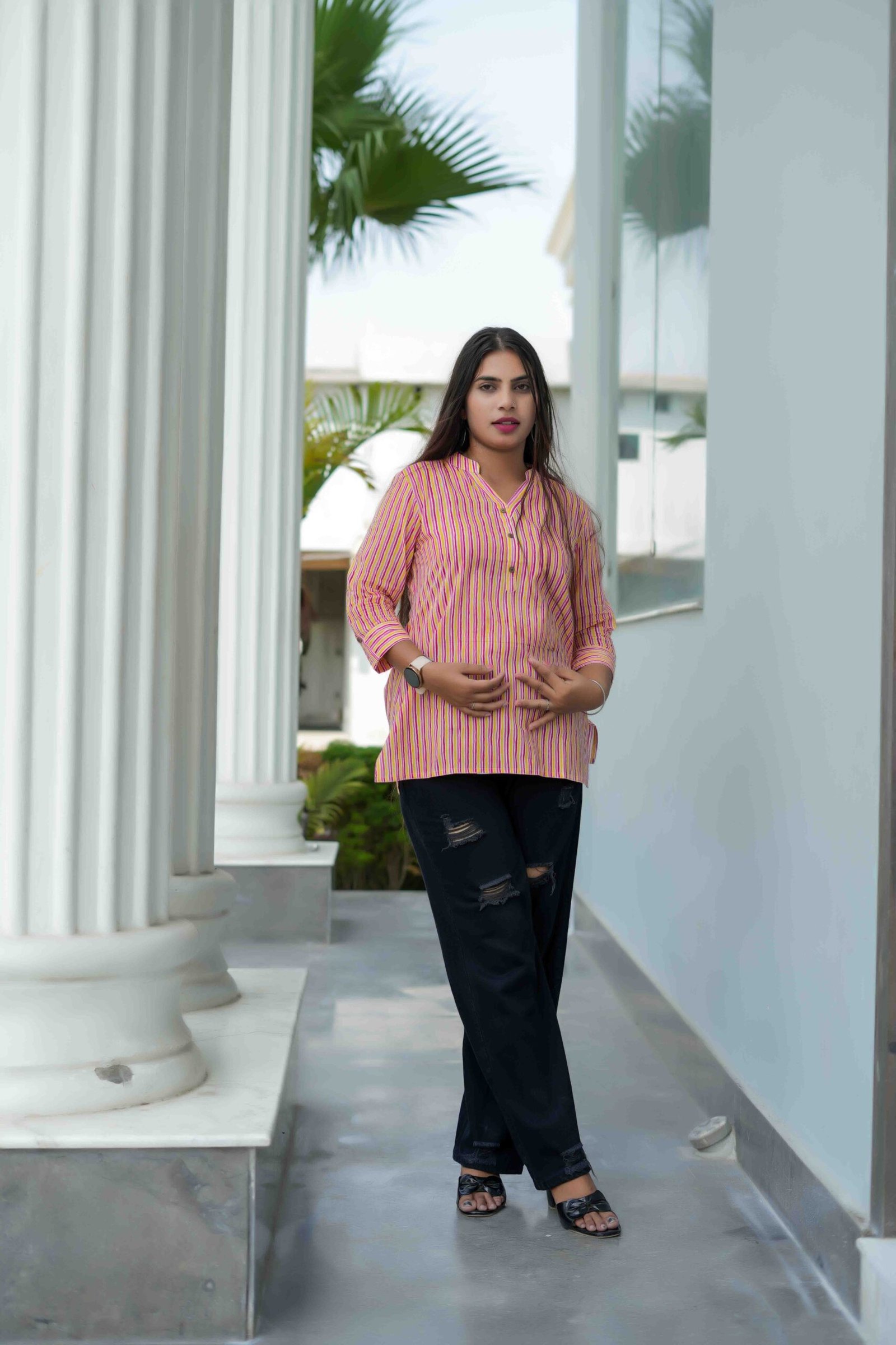 Stylish striped cotton tunic featuring a V-neck with button detailing, 3/4th sleeves, and side slits—perfect for a casual yet chic look.