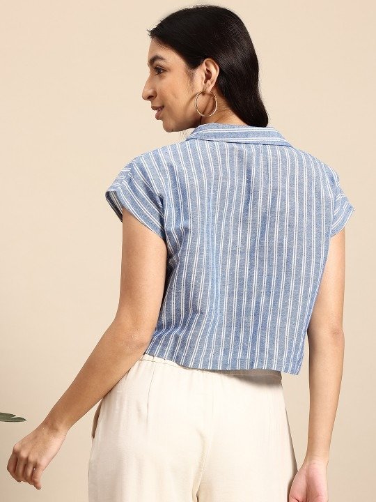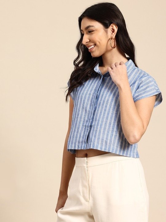 The outfit features a blue and white vertically striped cropped shirt with a collared neckline and short, rolled sleeves . The overall vibe is chic and effortless—perfect for warm-weather outings or relaxed casual wear.