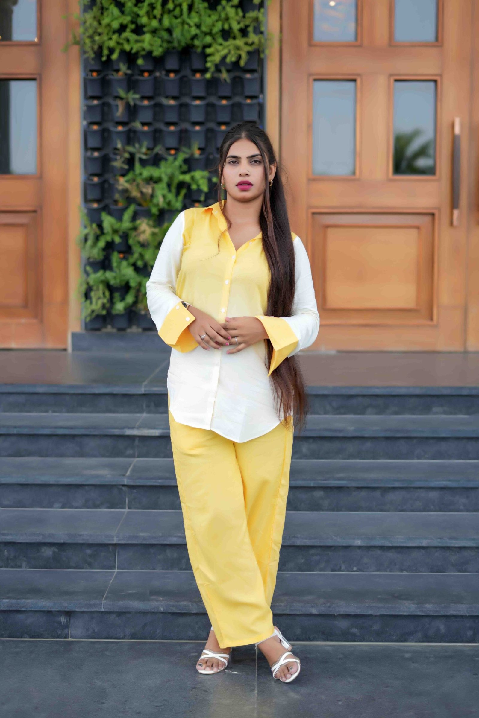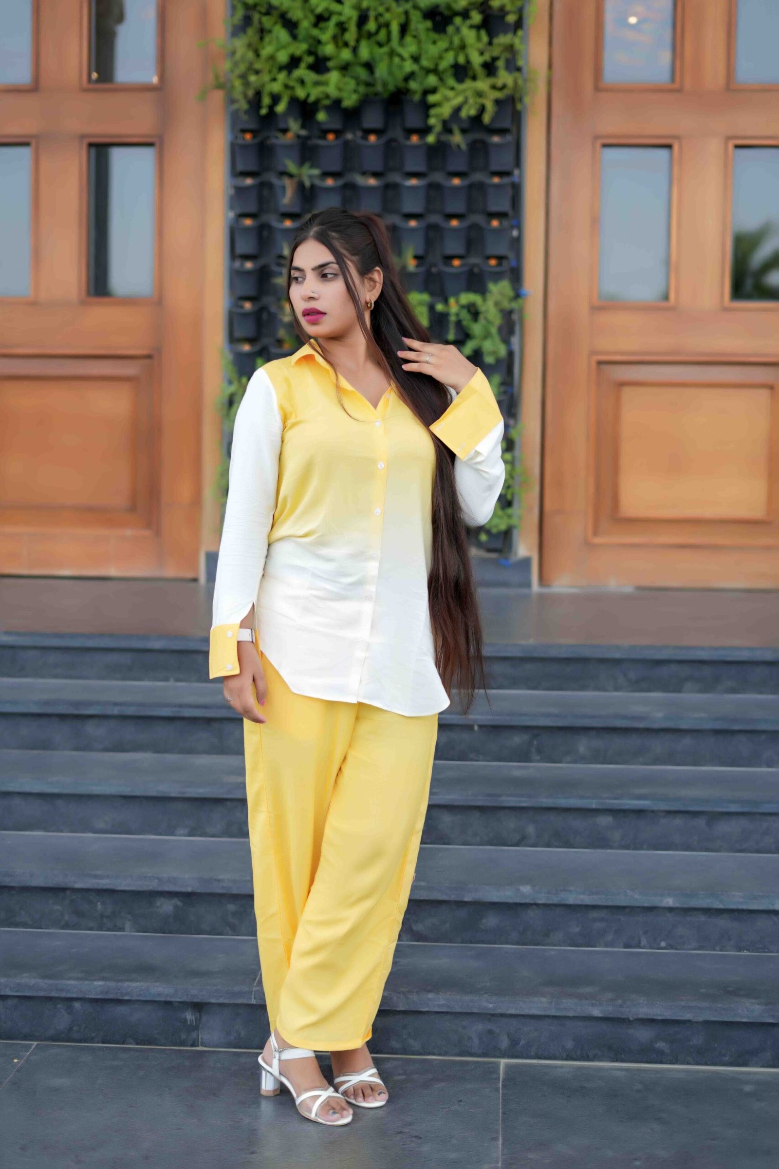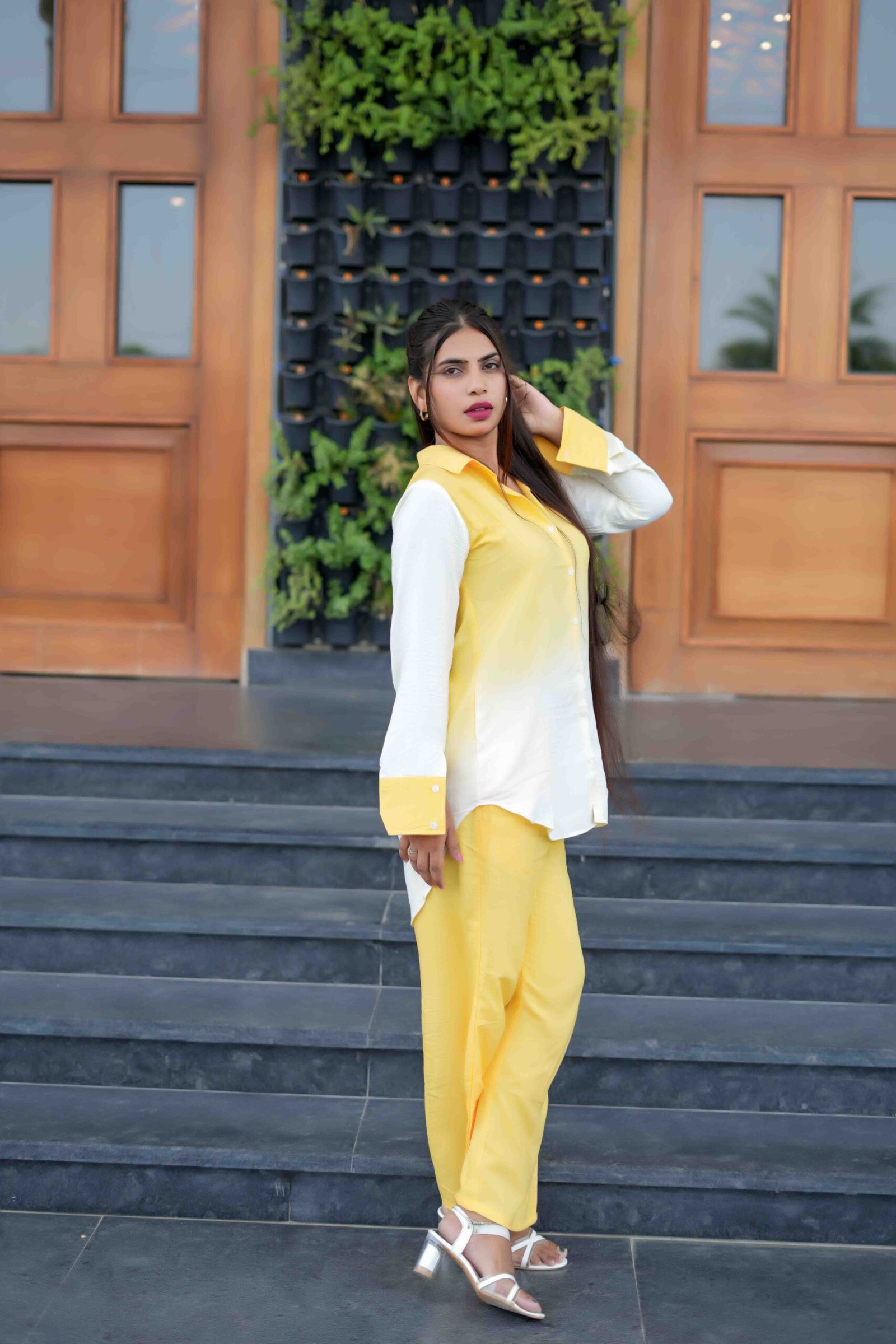 This outfit features a stylish ombré shirt in shades of yellow and white, paired with relaxed yellow trousers. The shirt has full sleeves with wide cuffs and a classic collar, offering a modern yet comfortable look perfect for casual or semi-formal occasions.