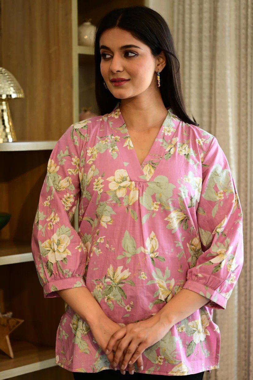 A soft and elegant mauve floral printed Tunic with a V-neckline and gathered front detailing. Features 3/4th balloon sleeves and a relaxed fit — perfect for a laid-back, stylish everyday look.