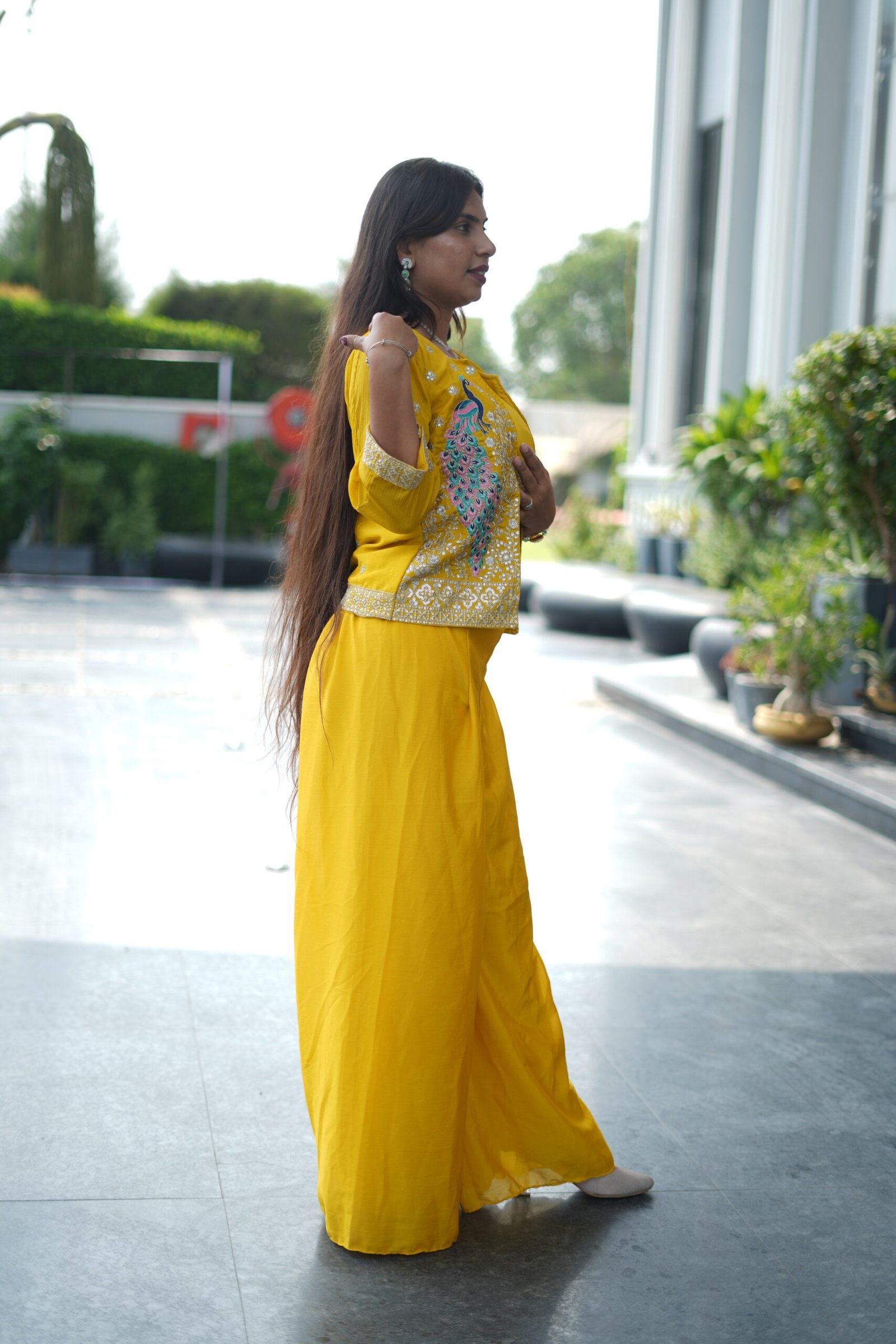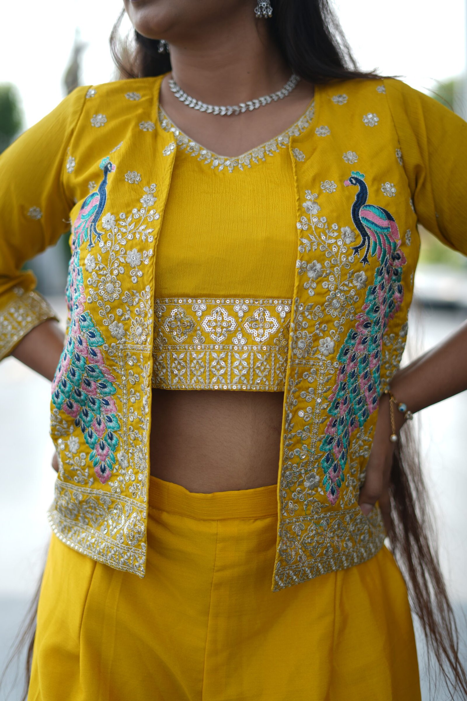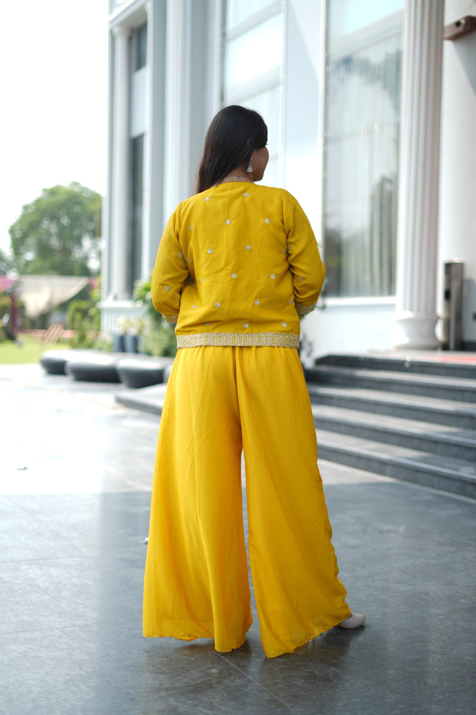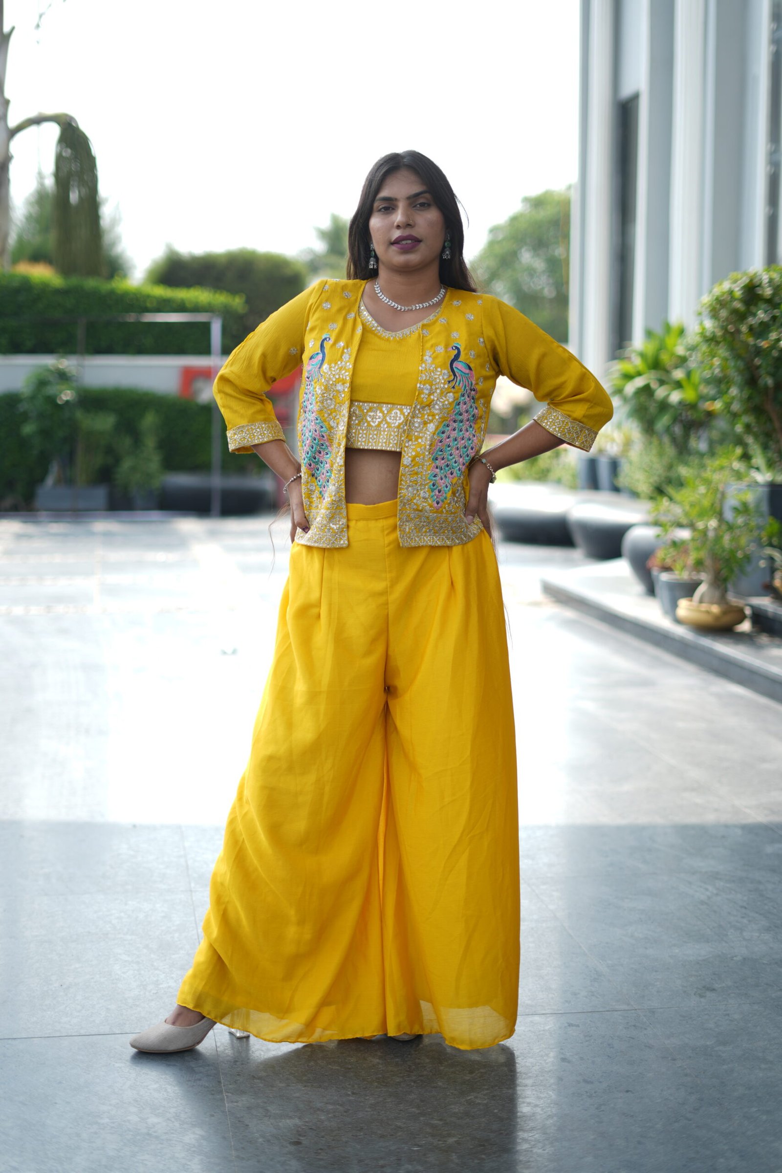 Step into elegance with this Yellow Embroidered Co-Ord Set for Women, a perfect blend of contemporary design and traditional craftsmanship. This stylish 3-piece ethnic set includes a sleeveless crop top, wide-leg palazzo pants, and a beautifully embroidered jacket that instantly elevates your festive or party look.