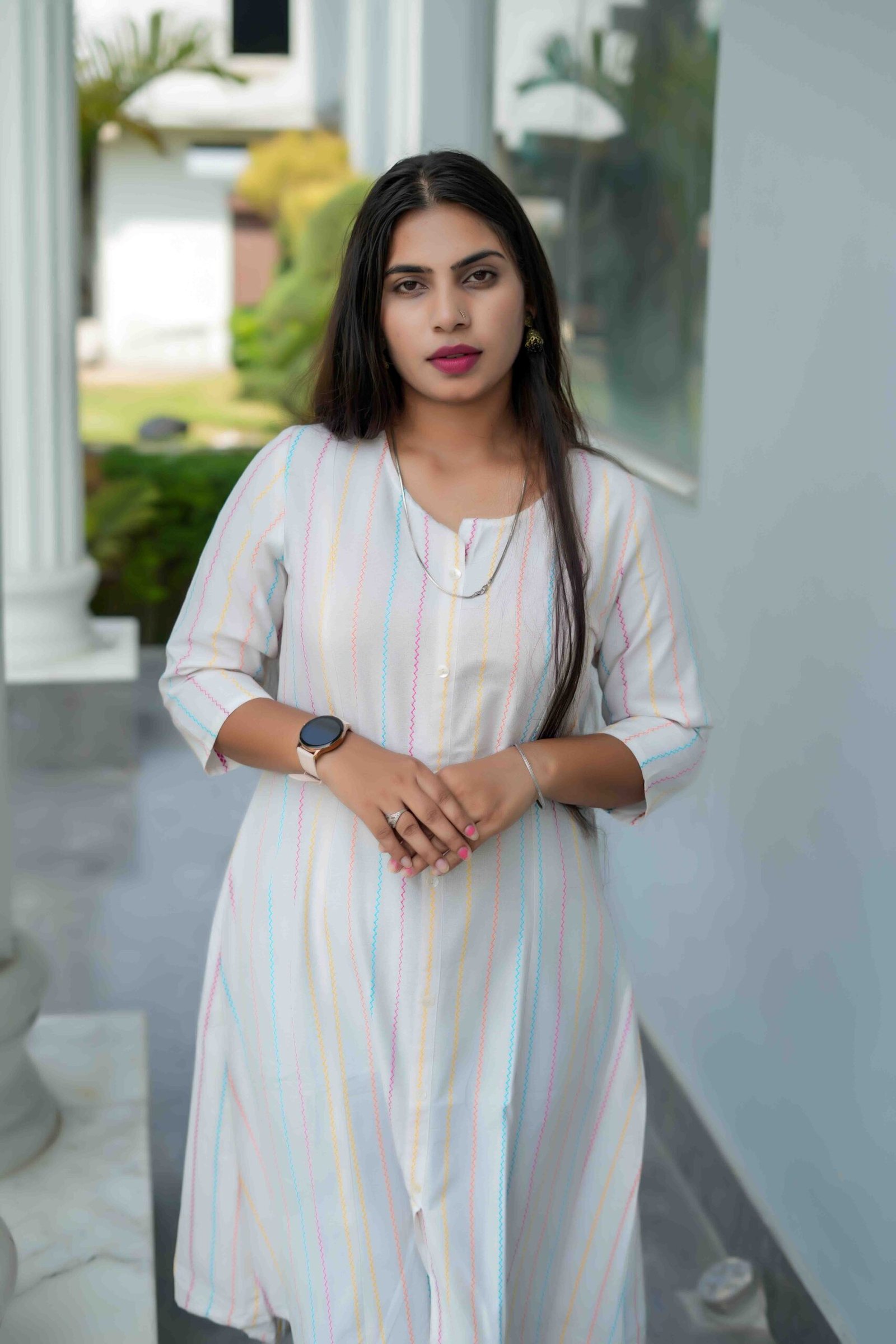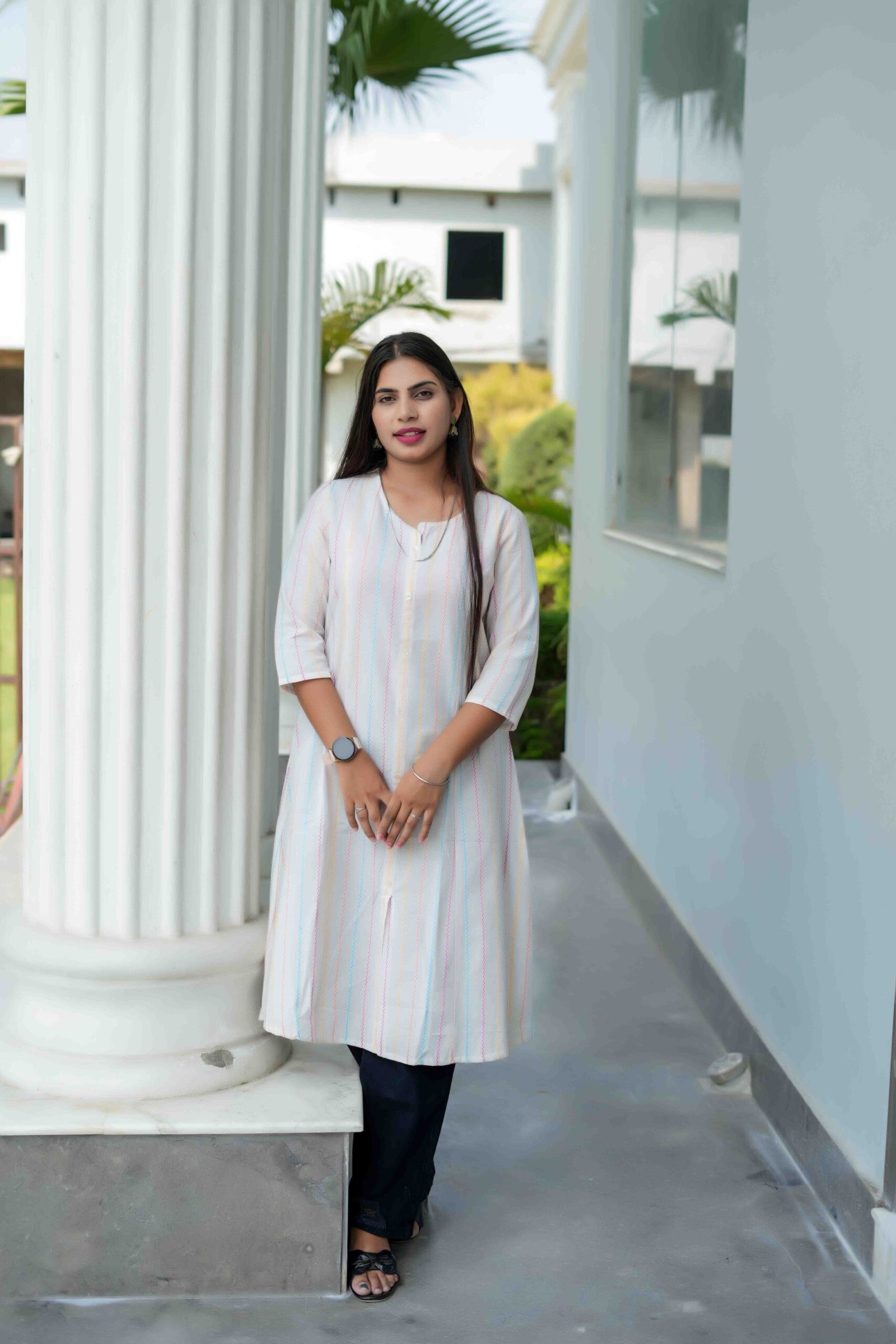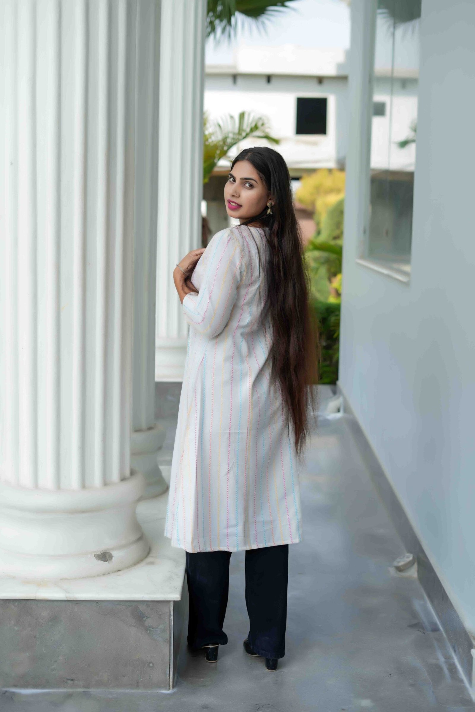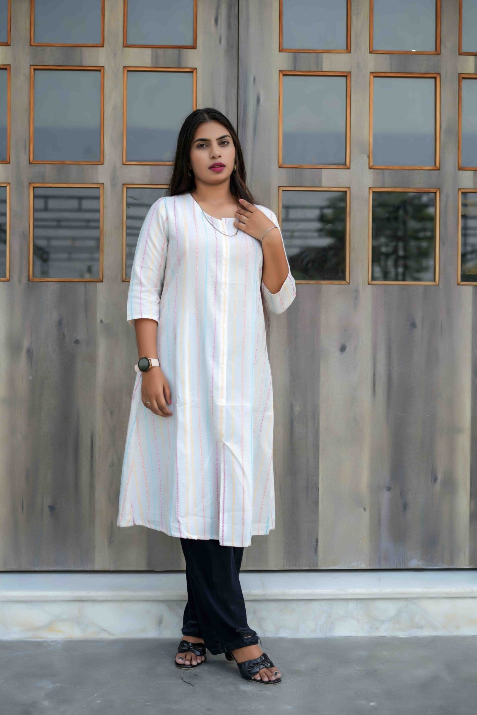A white kurti featuring multicolor zigzag threadwork stripes, designed with a straight cut and a notch neckline. It has 3/4th sleeves and a front button placket for a minimal yet elegant everyday look.